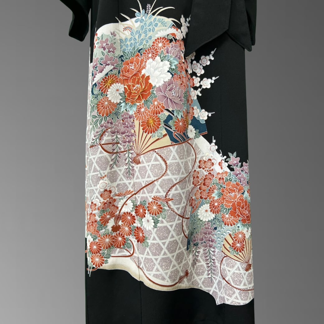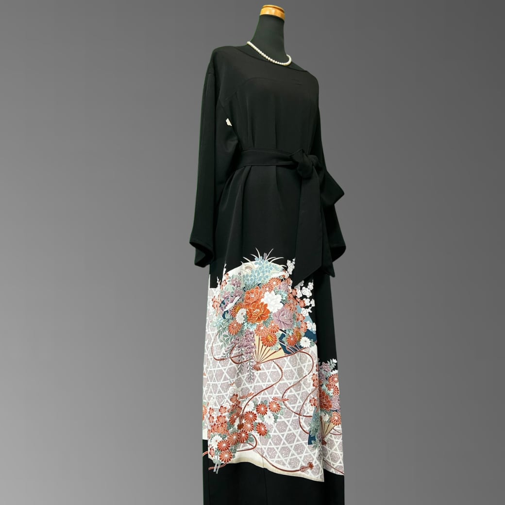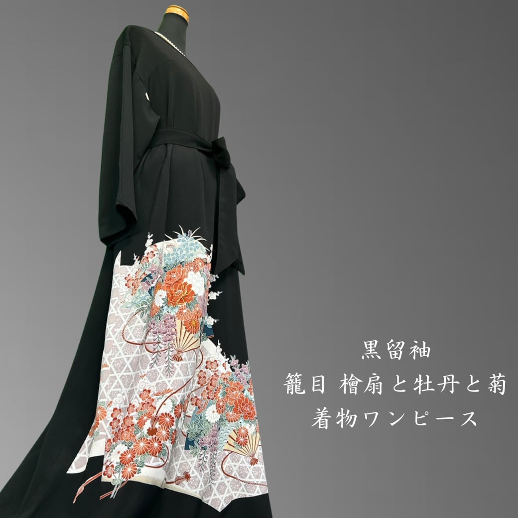 黒留袖 籠目 檜扇と牡丹と菊 着物ワンピース