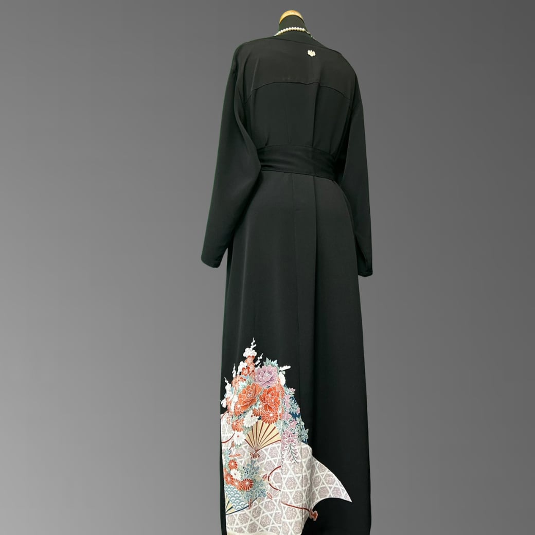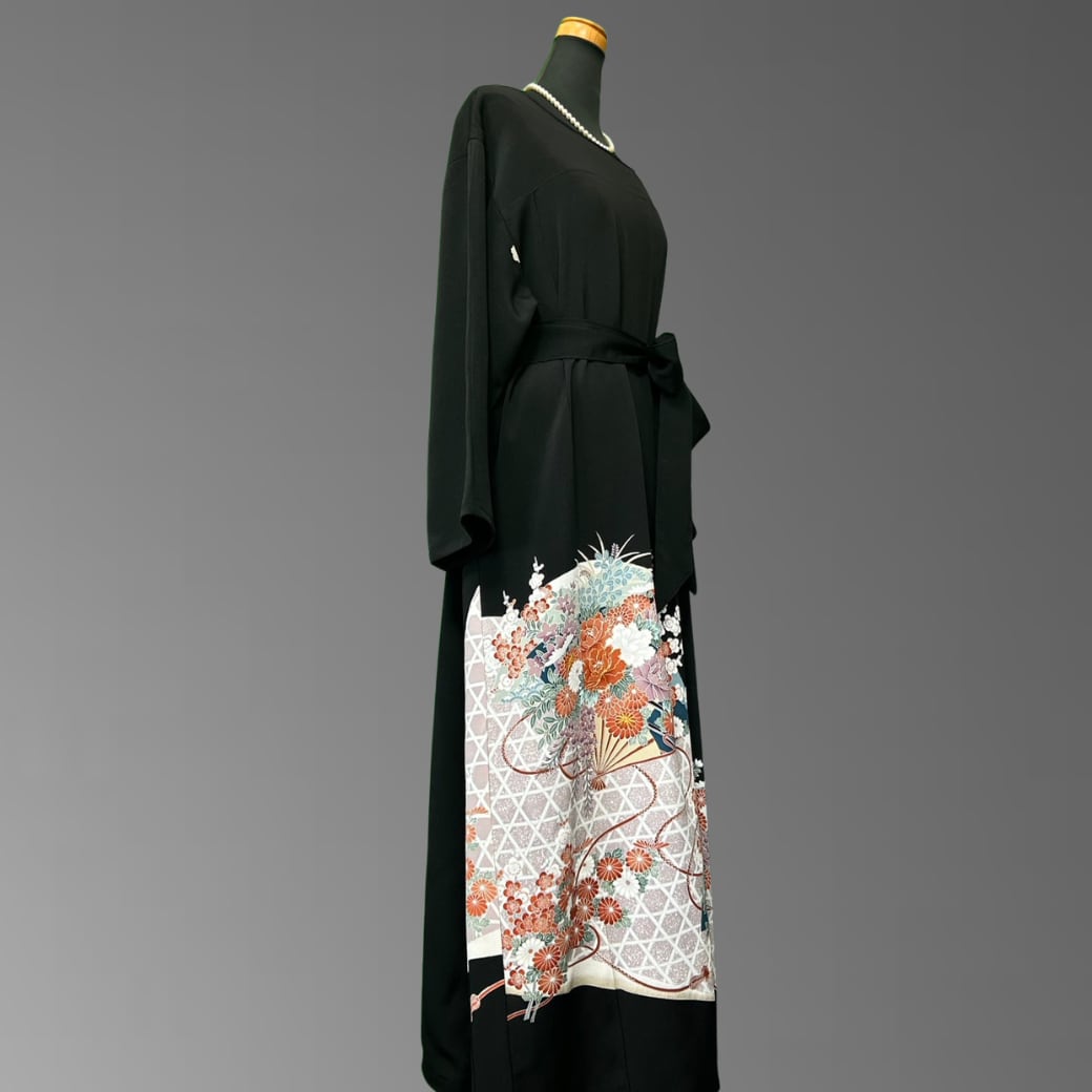 こちらの着物ワンピースは、格式高い黒留袖から仕立てました。