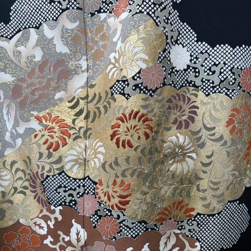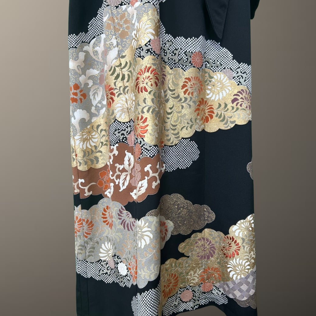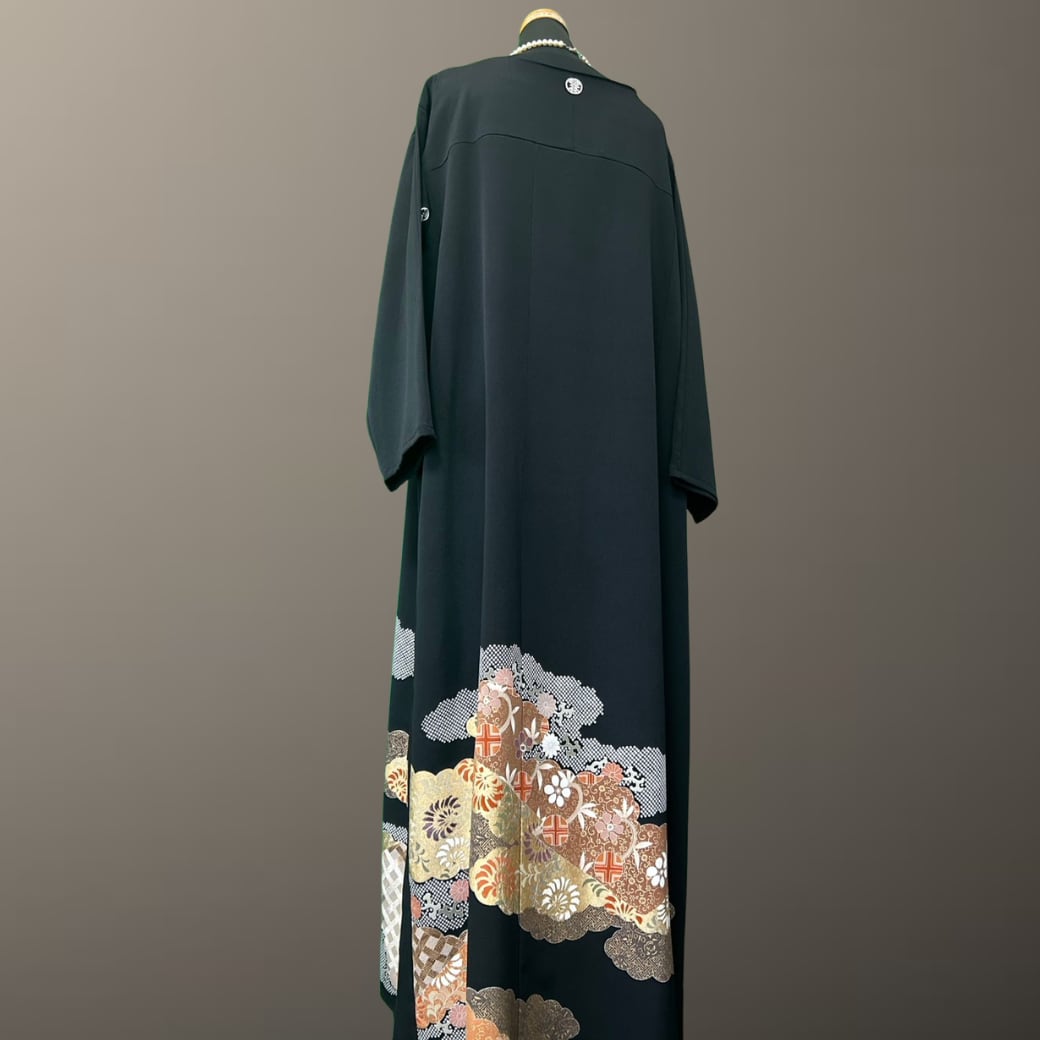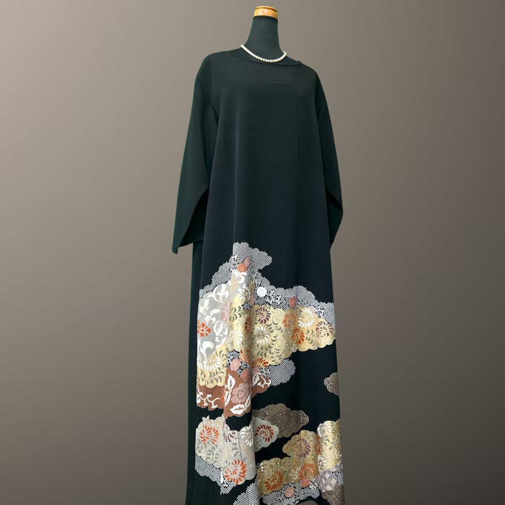 黒留袖 金彩 鹿の子 雲取り 一部花刺繍 着物ワンピース