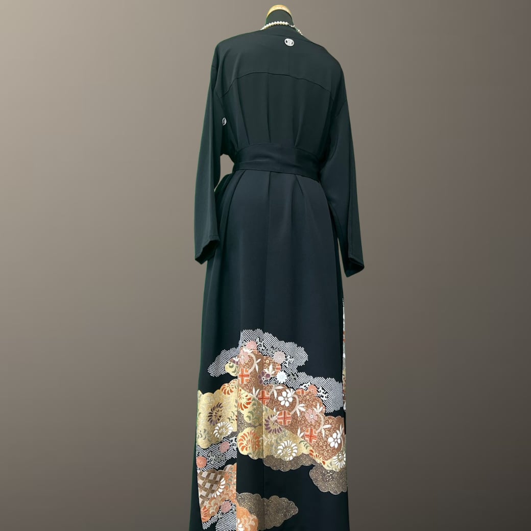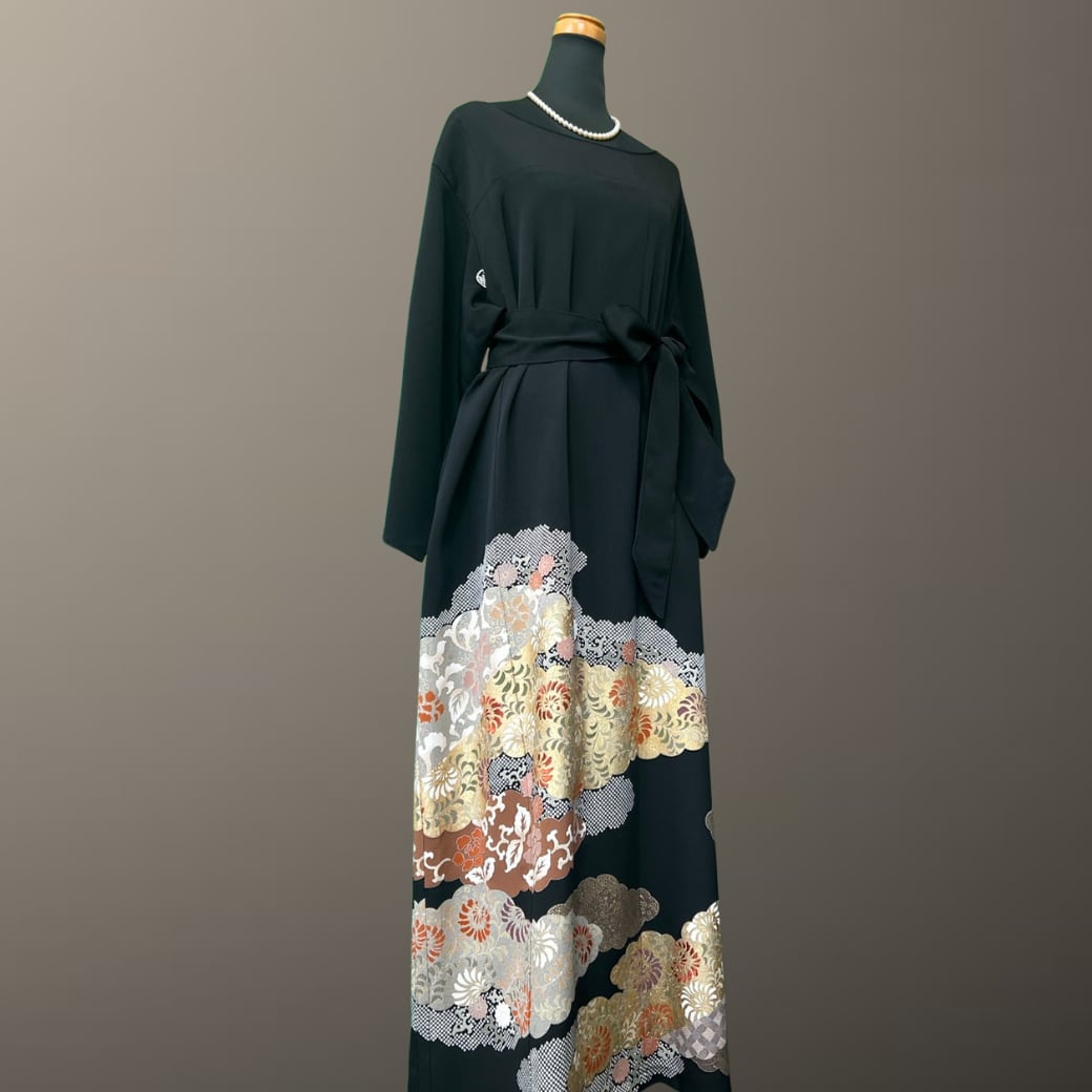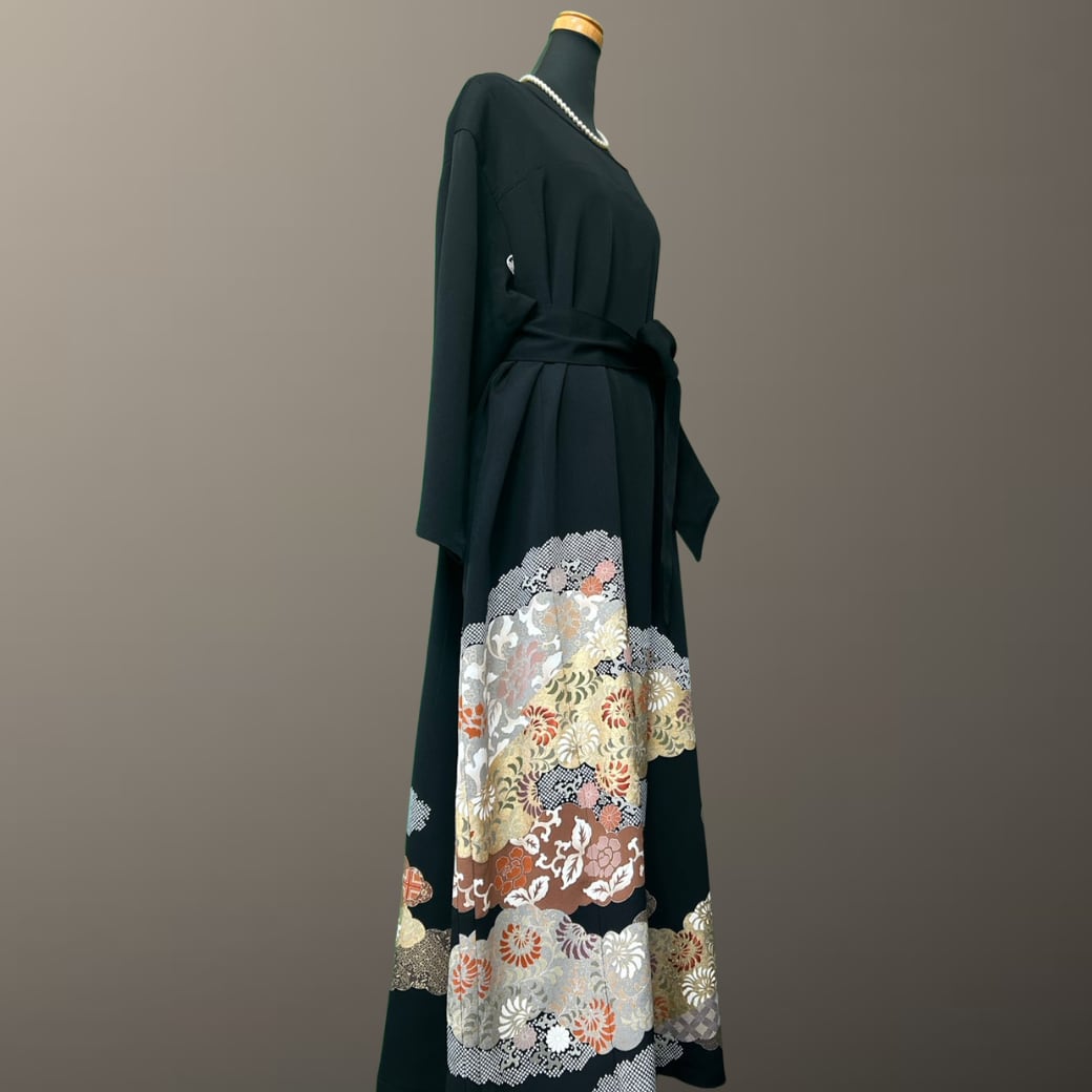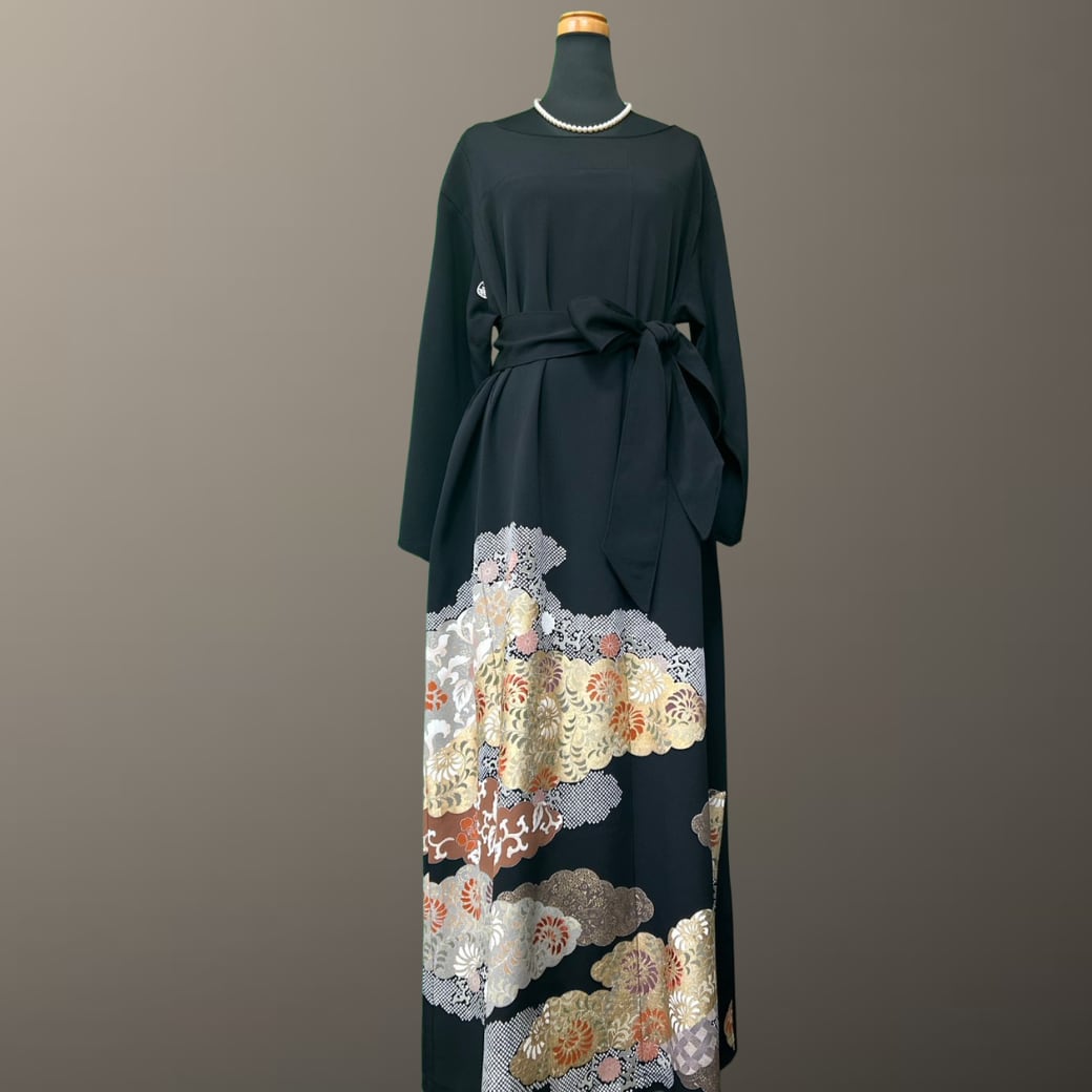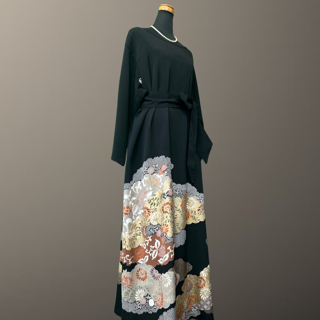 こちらの着物ワンピースは、格式ある黒留袖から仕立てた一着です。