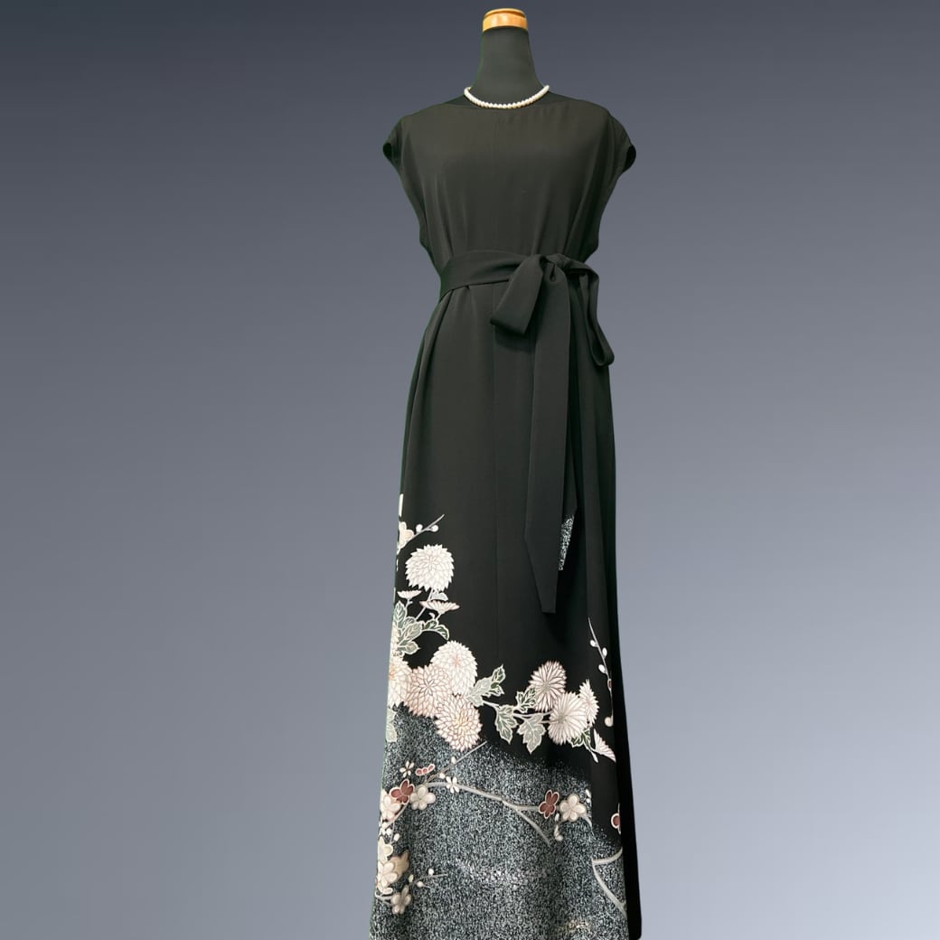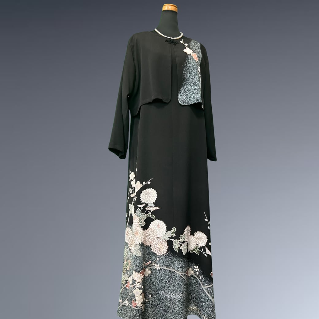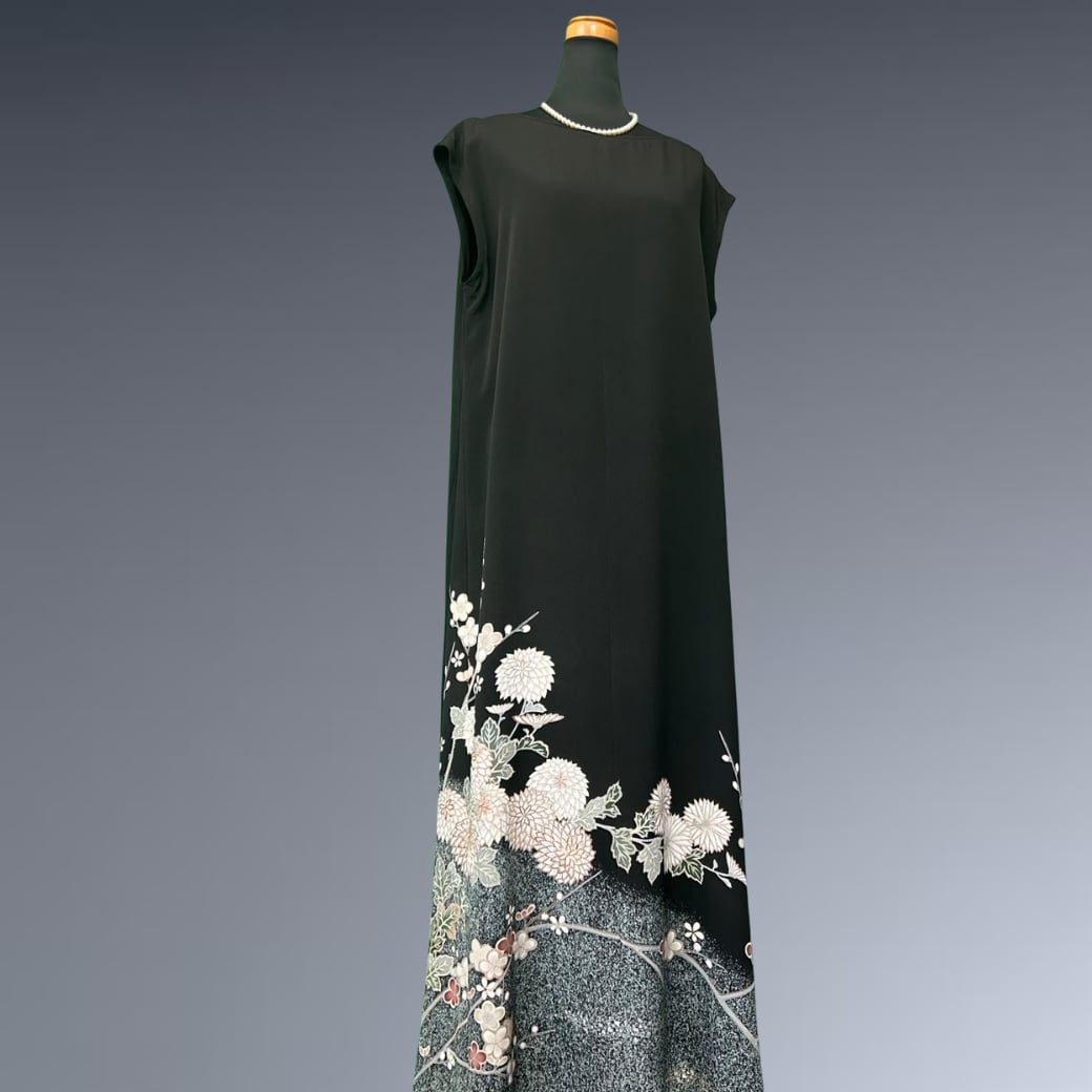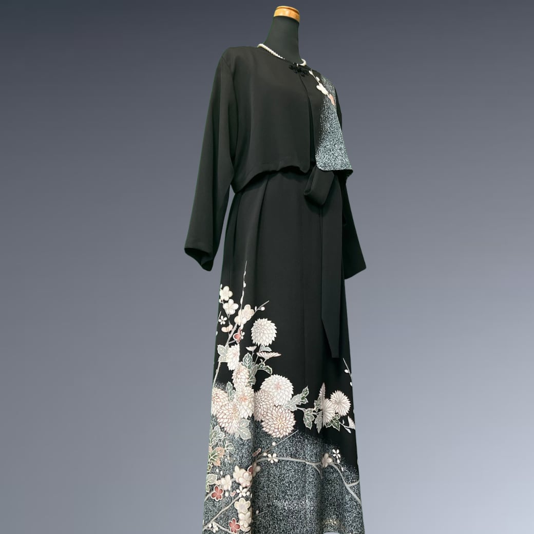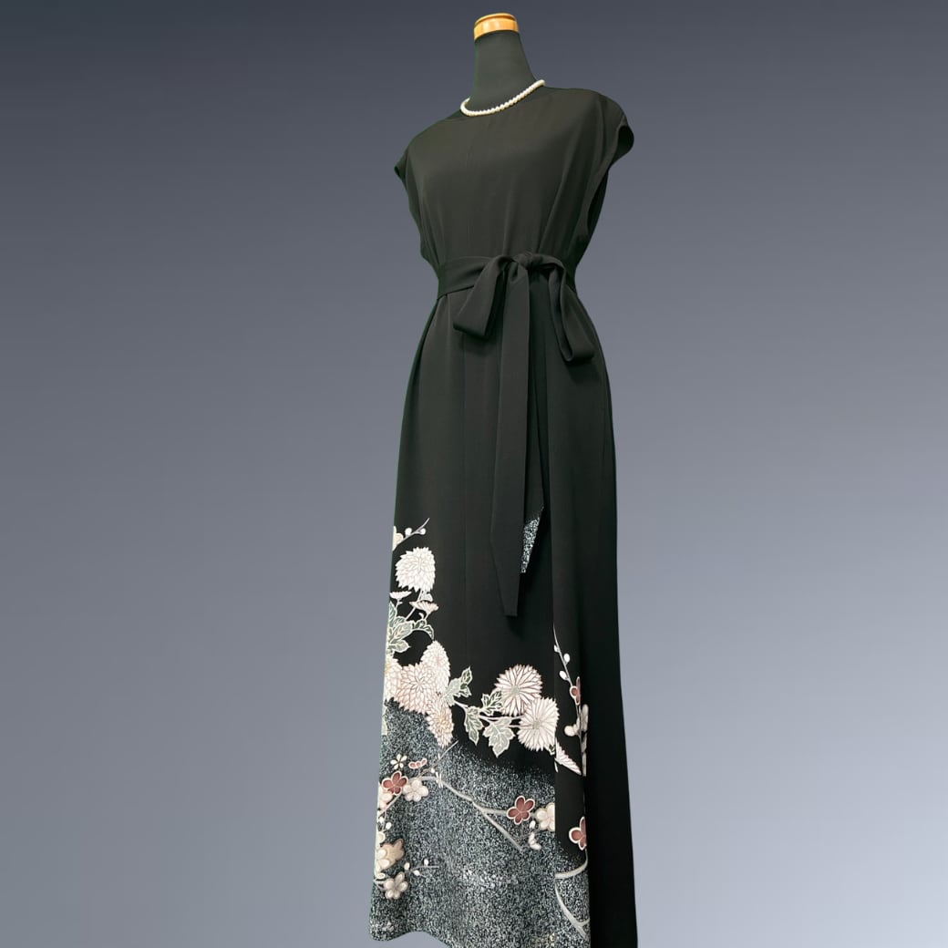 こちらの着物ワンピースは、格式ある黒留袖から仕立てた一着です。