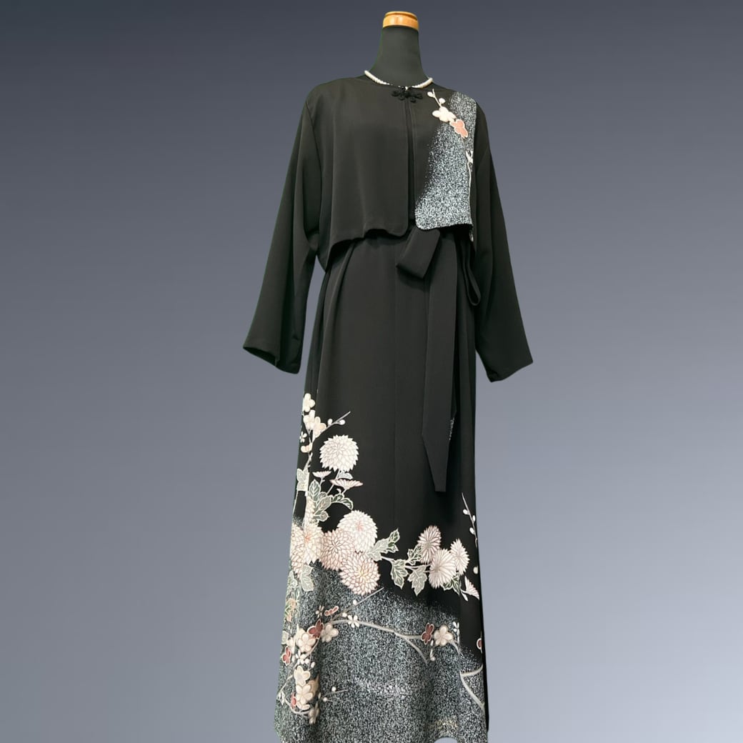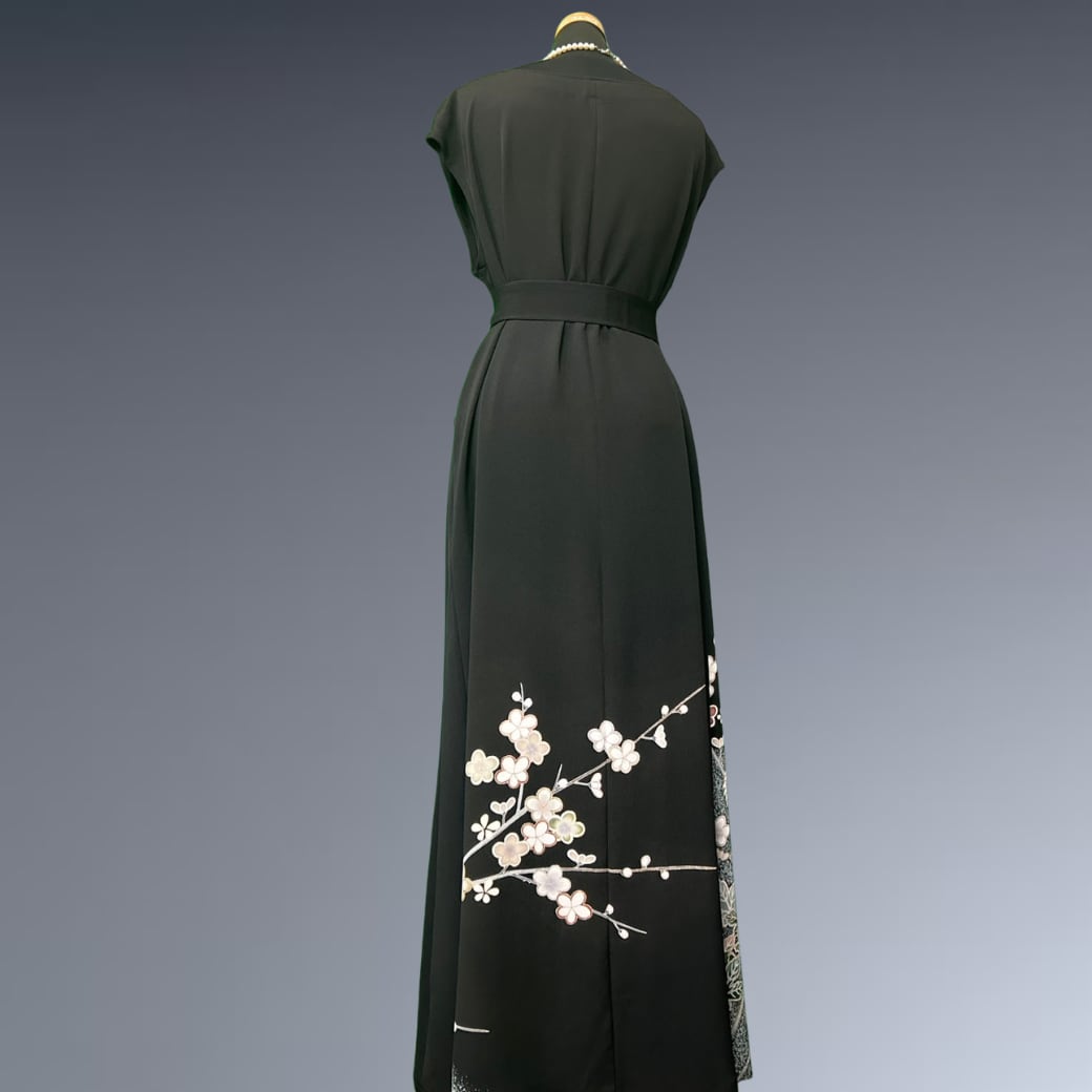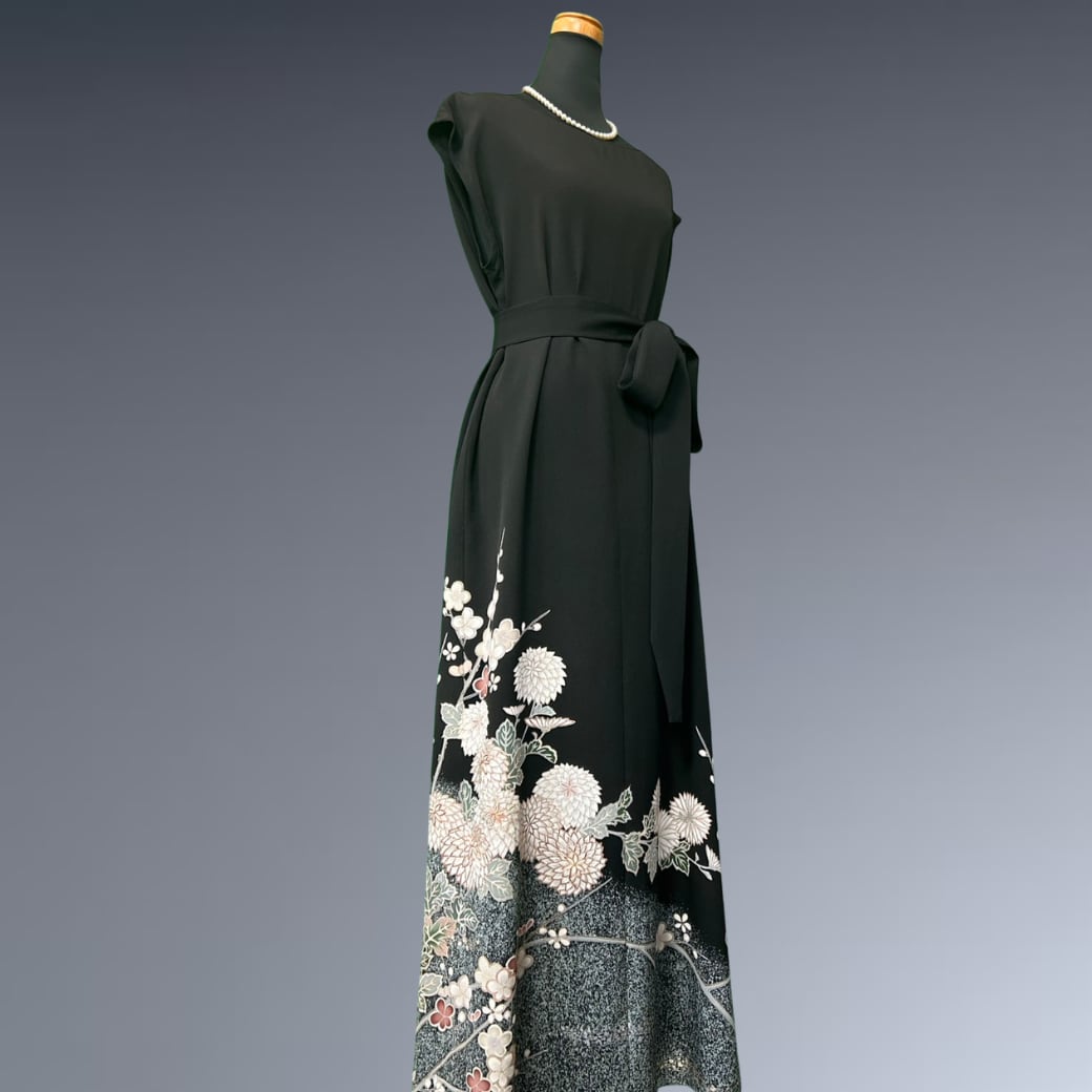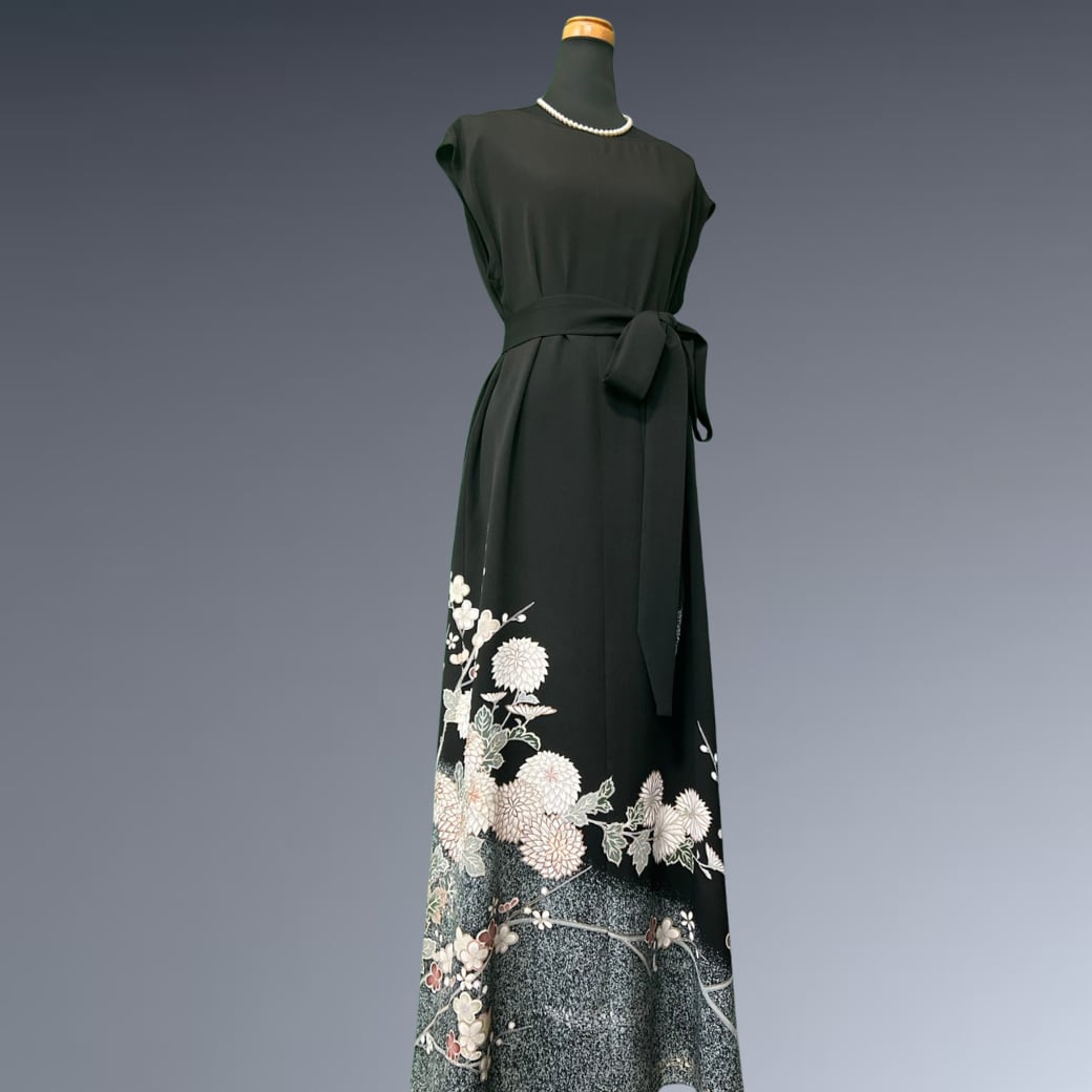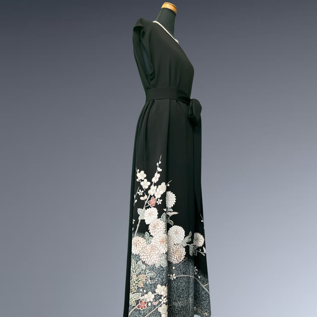 こちらの着物ワンピースは、格式ある黒留袖から仕立てた一着です。