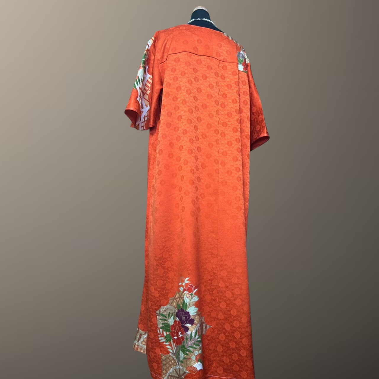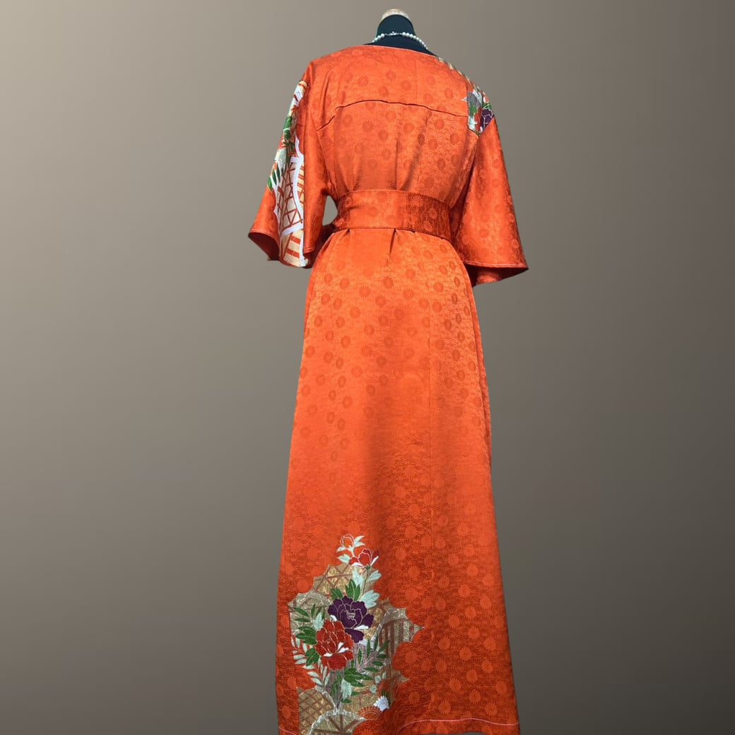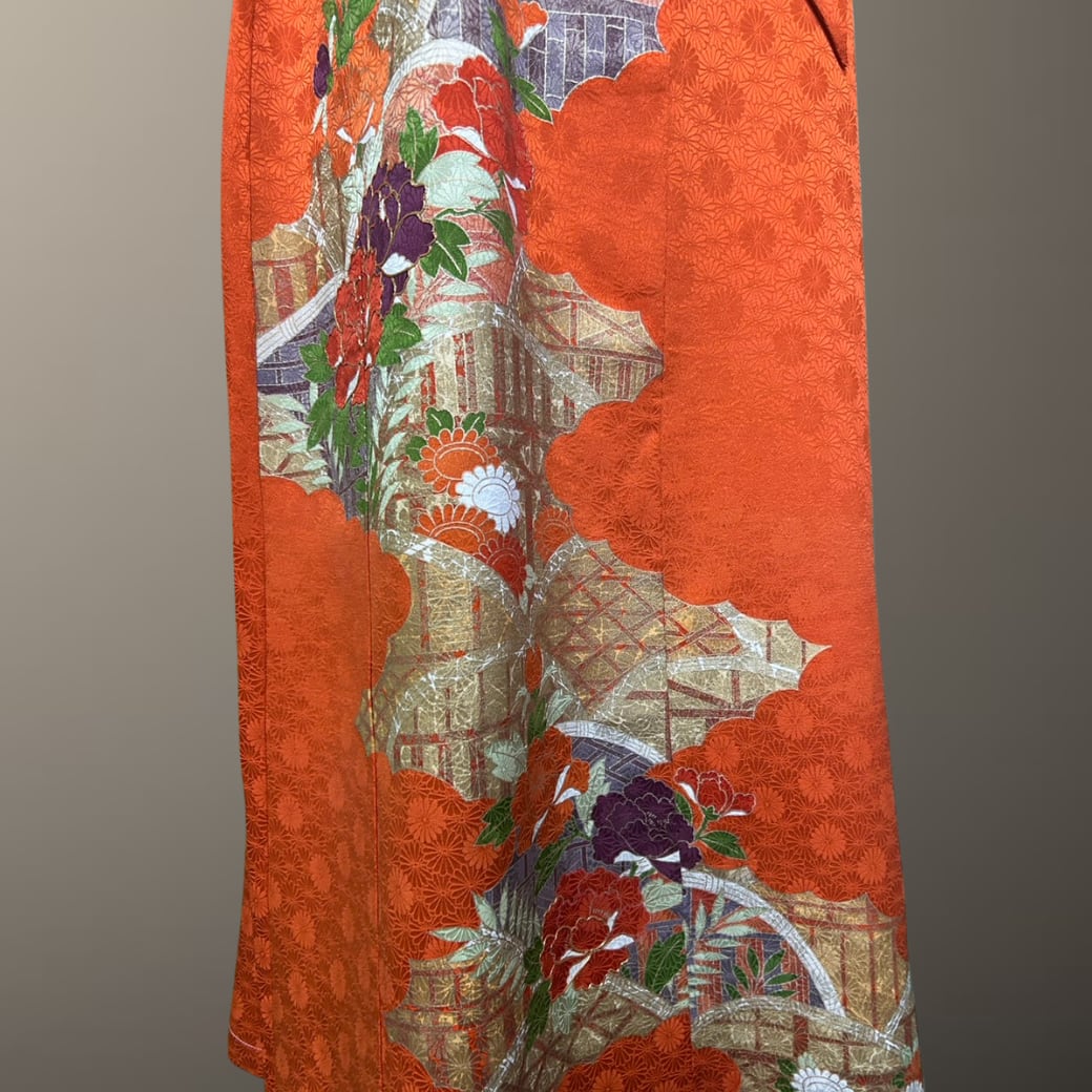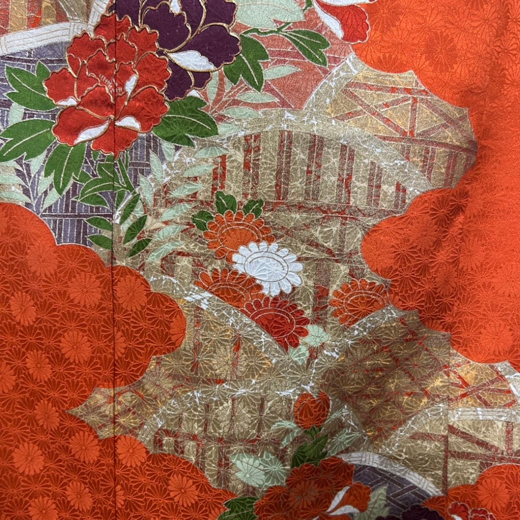 鮮やかな朱橙色の地に、華やかな花々と吉祥文様が広がる一着。