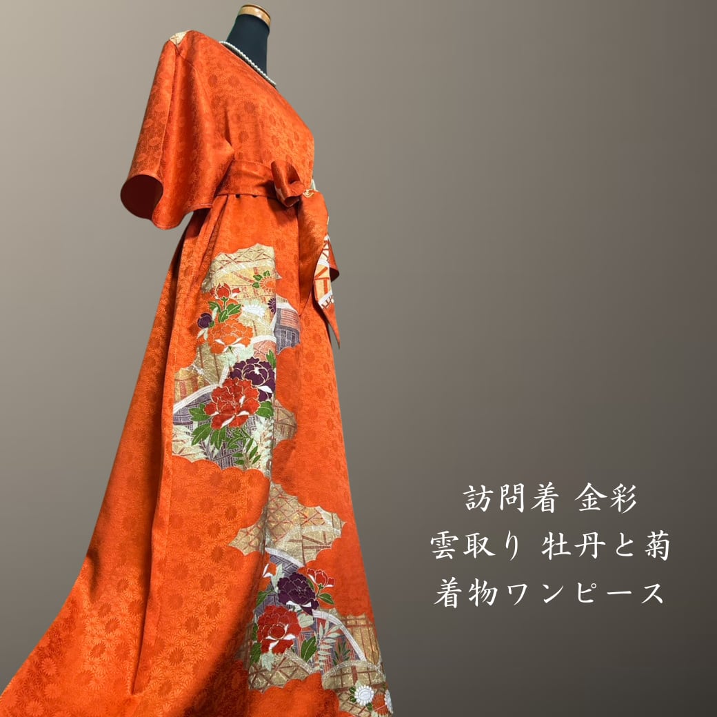 訪問着 金彩 雲取り 牡丹と菊 着物ワンピース