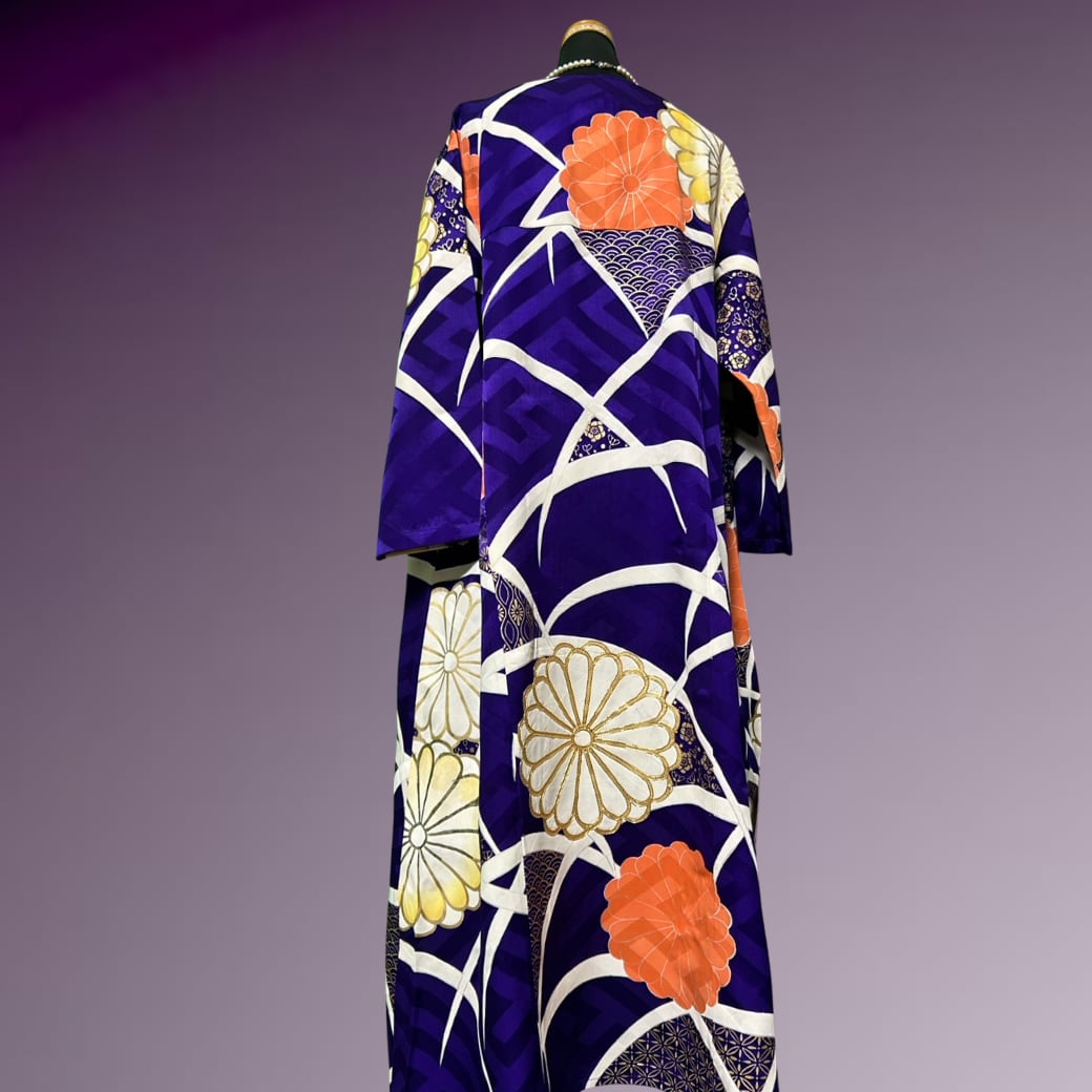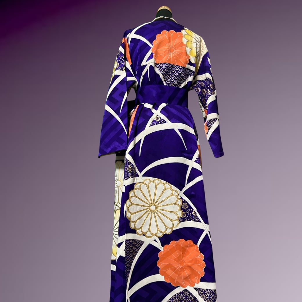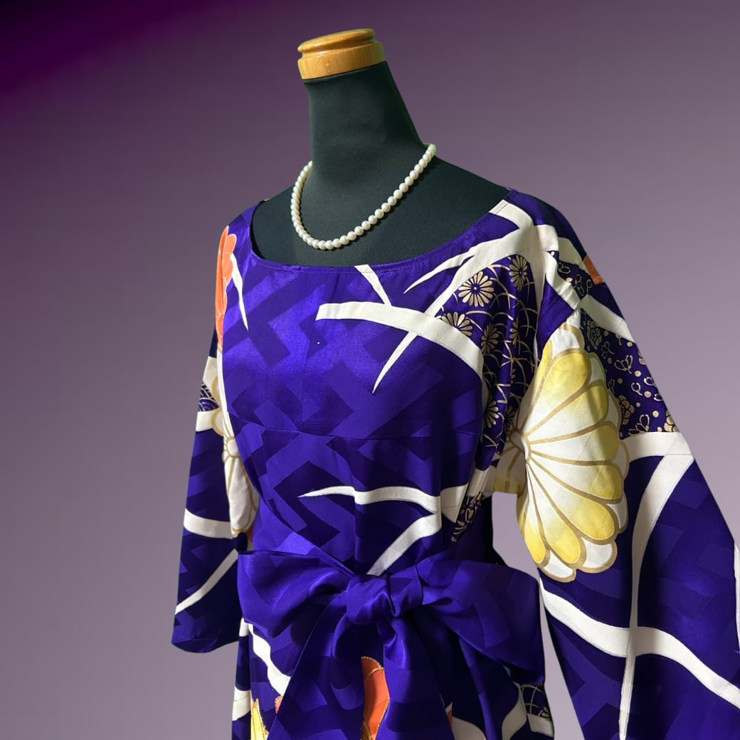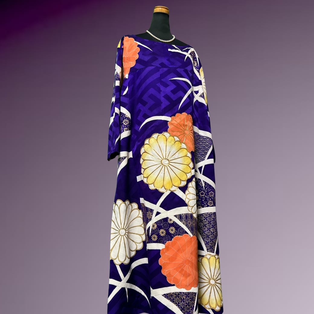 深く鮮やかな紫を基調に、菊の花と青海波の意匠が大胆に描かれた振袖から仕立てた一着です。