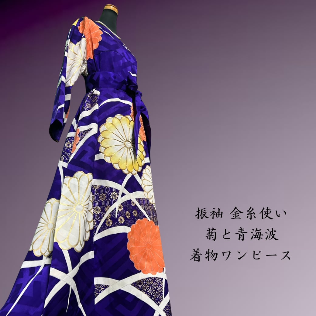 振袖 金糸使い 菊と青海波 着物ワンピース