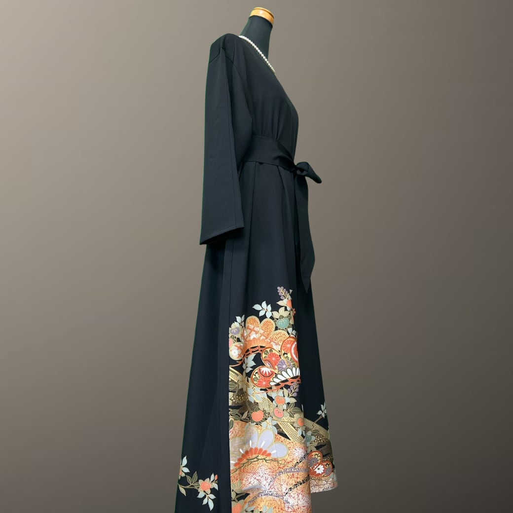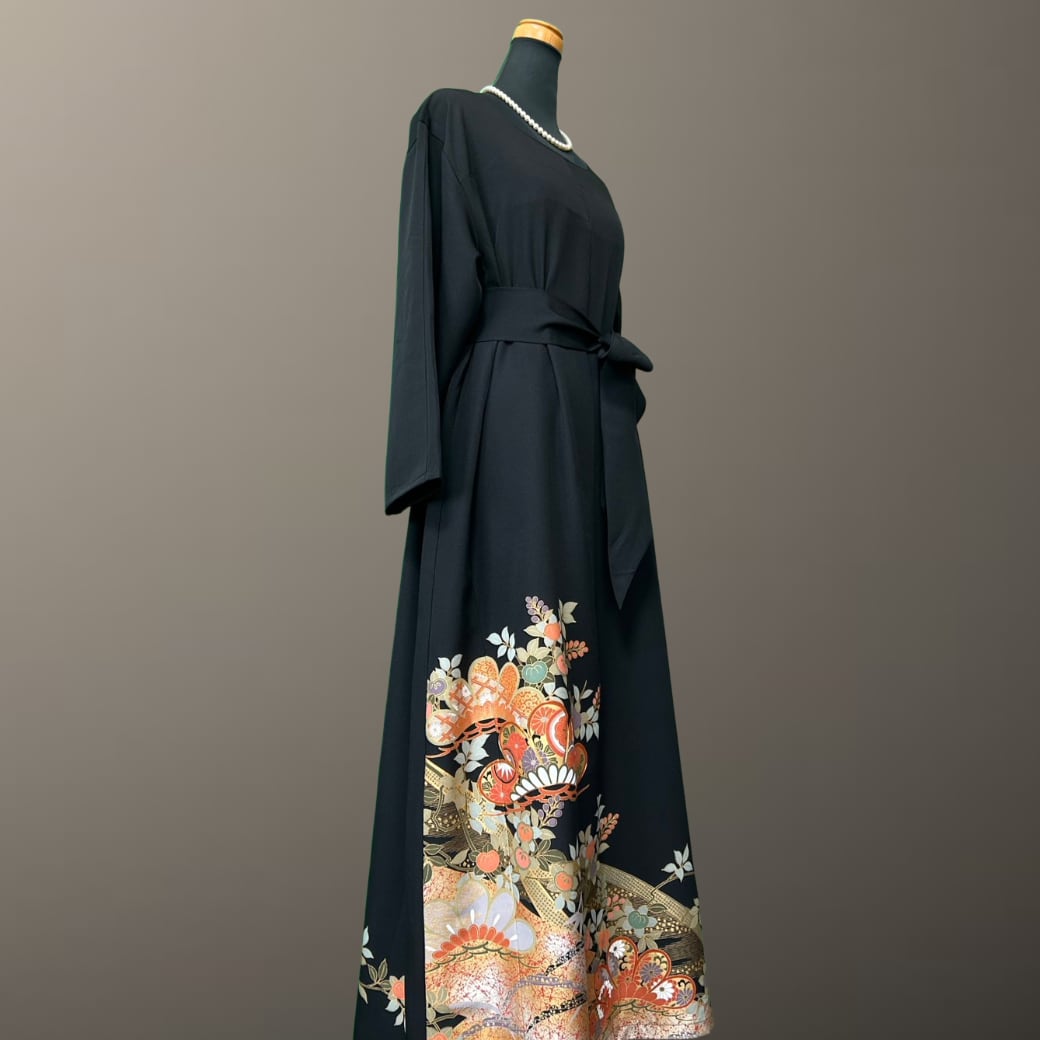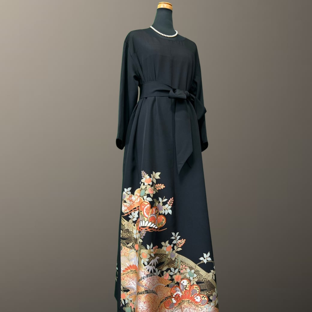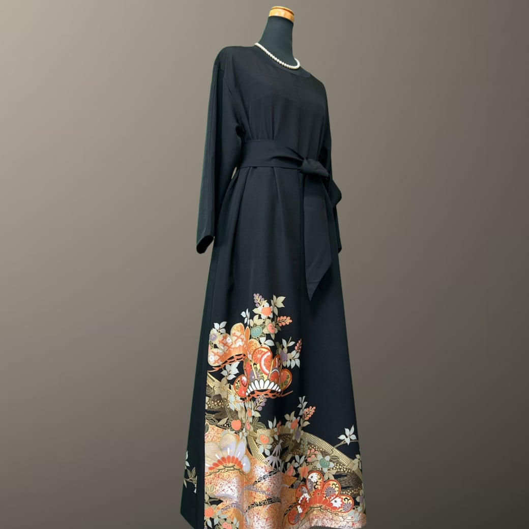 深みのある黒地に、金彩をまといながら華やかに描かれた意匠が印象的な、こちらの着物ワンピース。