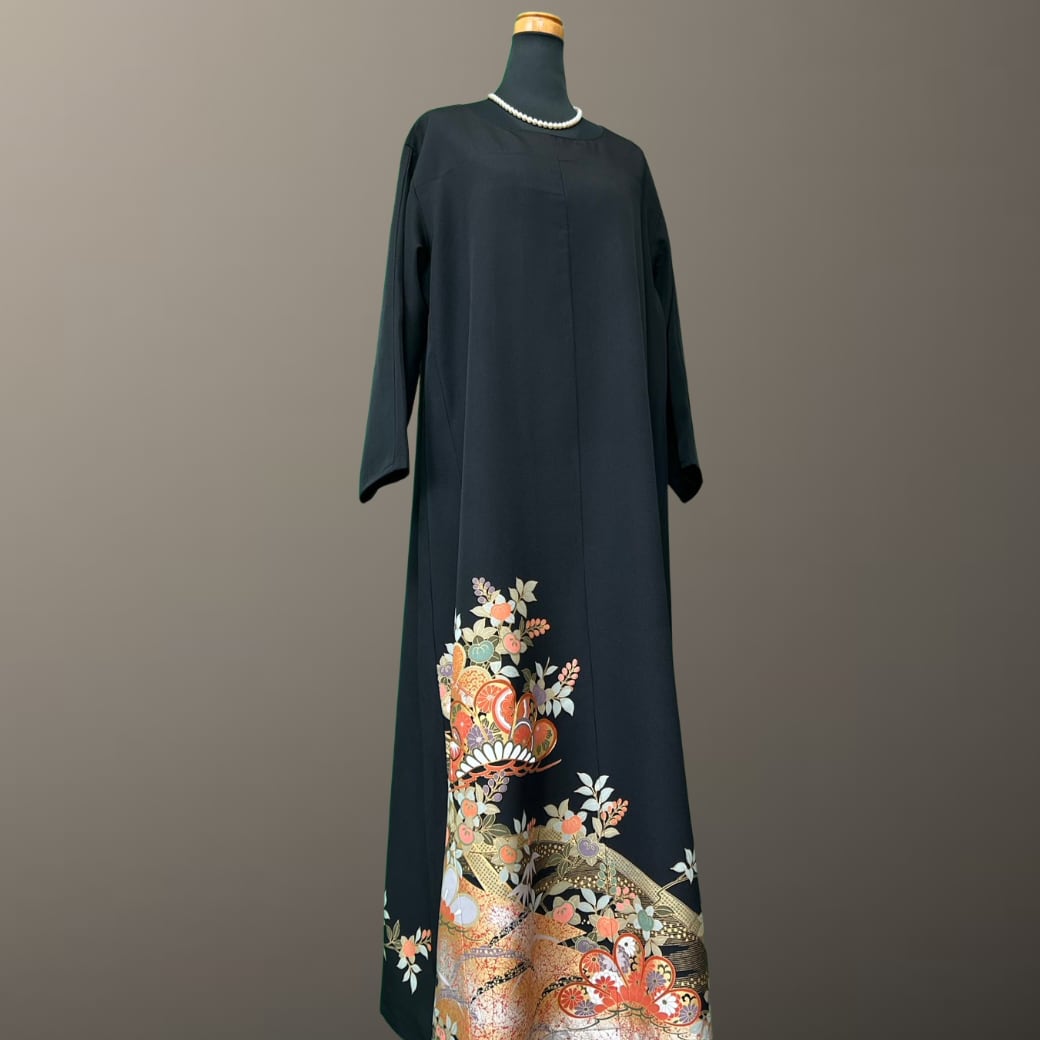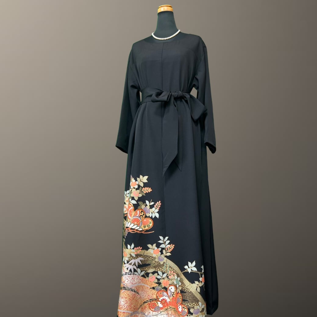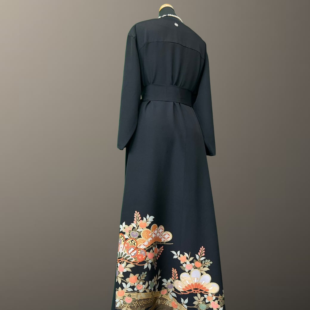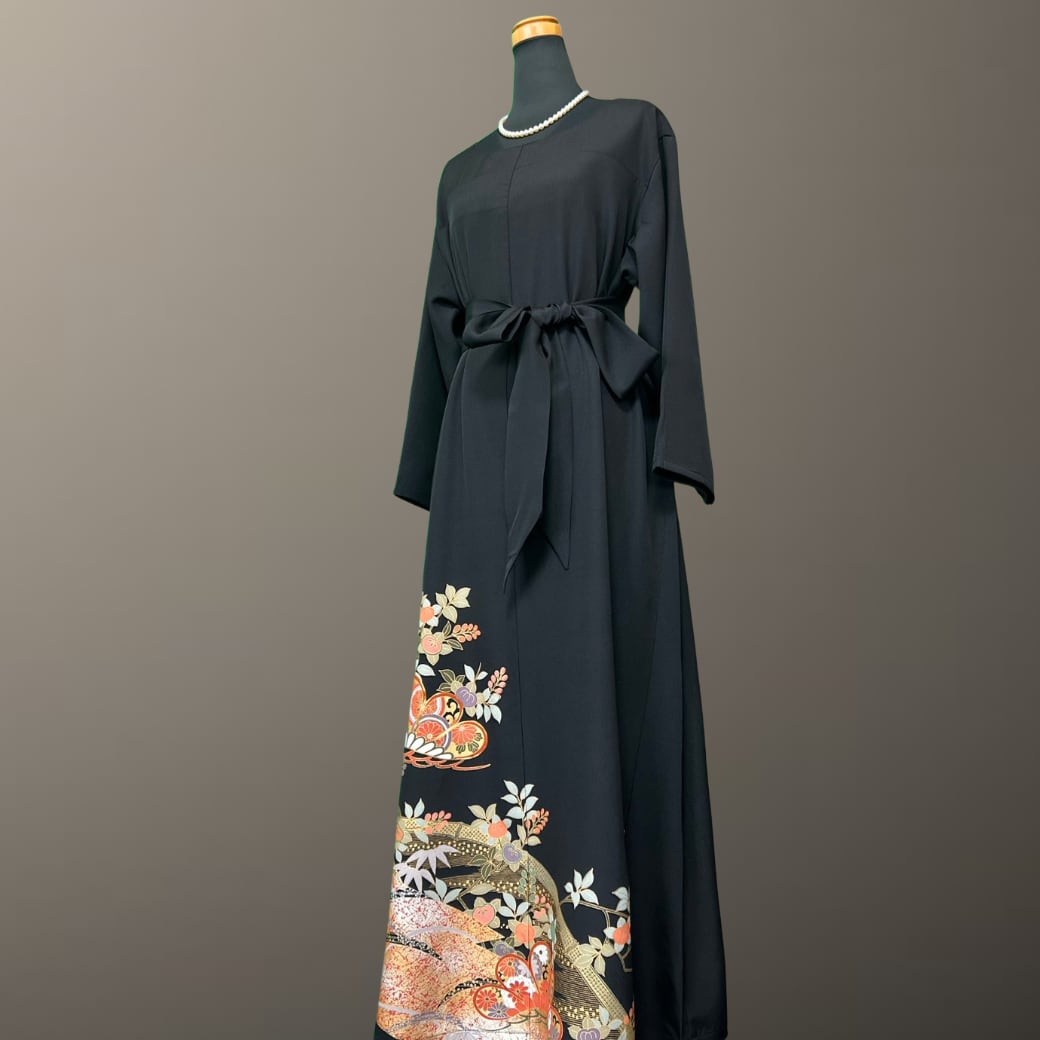 深みのある黒地に、金彩をまといながら華やかに描かれた意匠が印象的な、こちらの着物ワンピース。