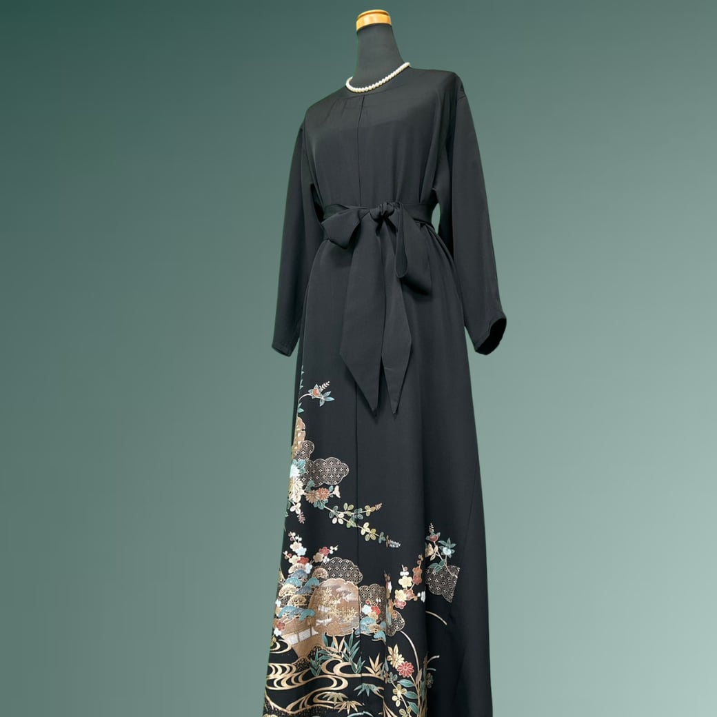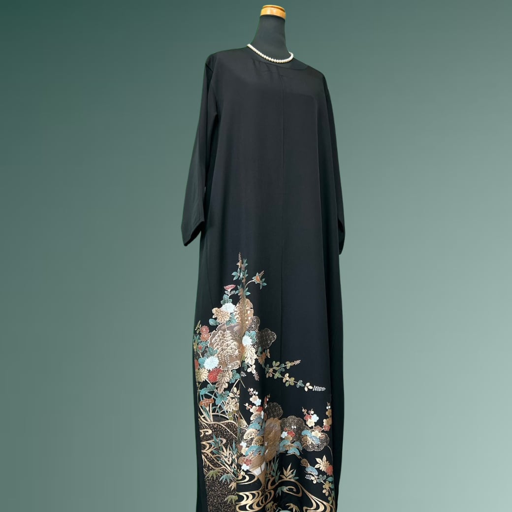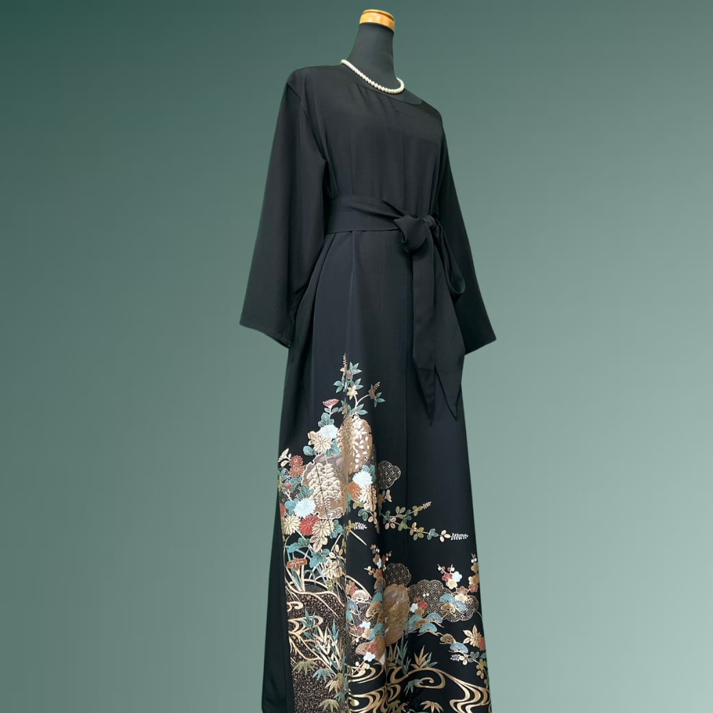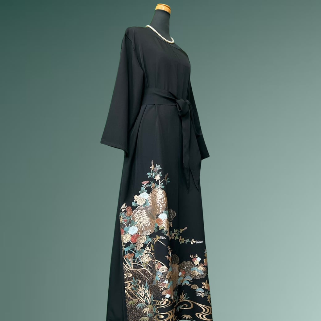 静かな黒地に、金彩をまとった繊細な意匠が美しく映える、こちらの着物ワンピース。