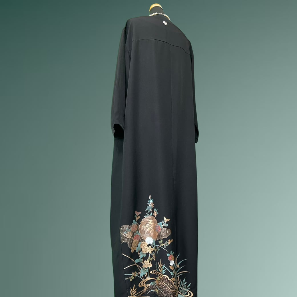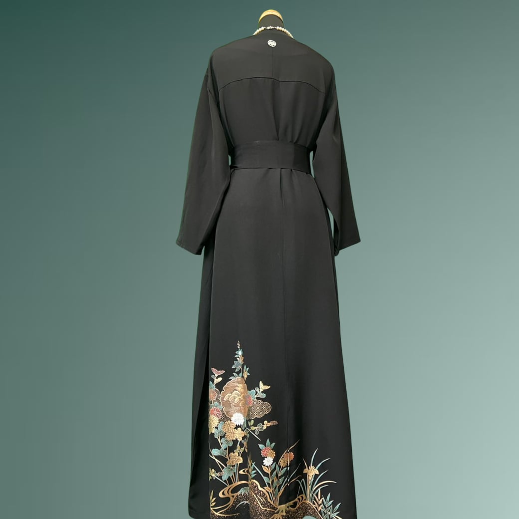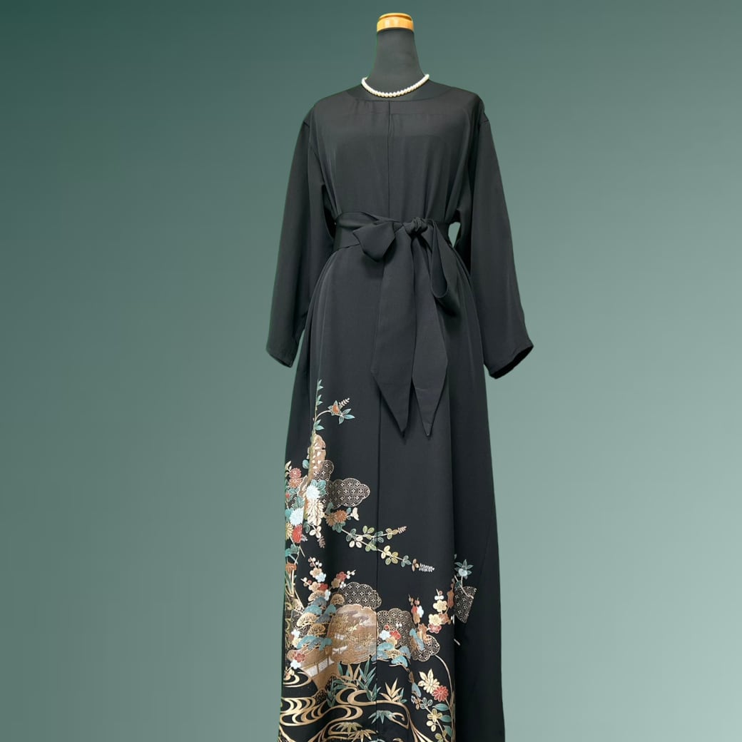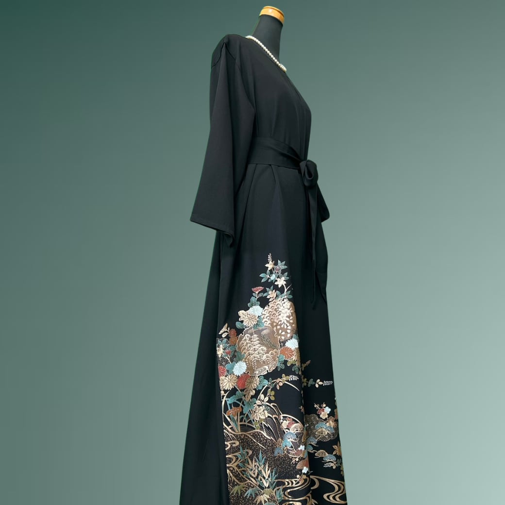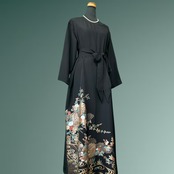 静かな黒地に、金彩をまとった繊細な意匠が美しく映える、こちらの着物ワンピース。