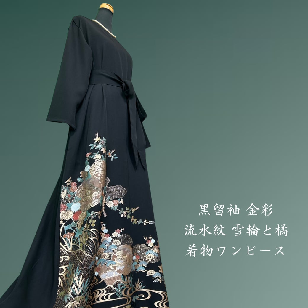 黒留袖 金彩 流水紋 雪輪と橘 着物ワンピース