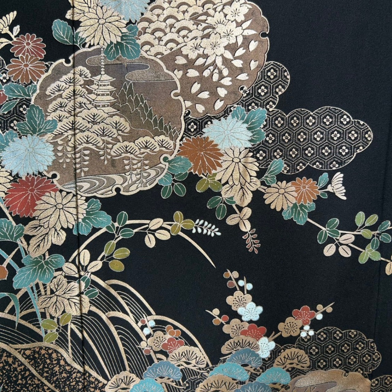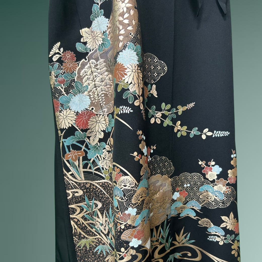裾にかけて広がる絵柄が、黒留袖ならではの格調と華やぎを感じさせ、落ち着きの中に凛とした存在感を宿しています。