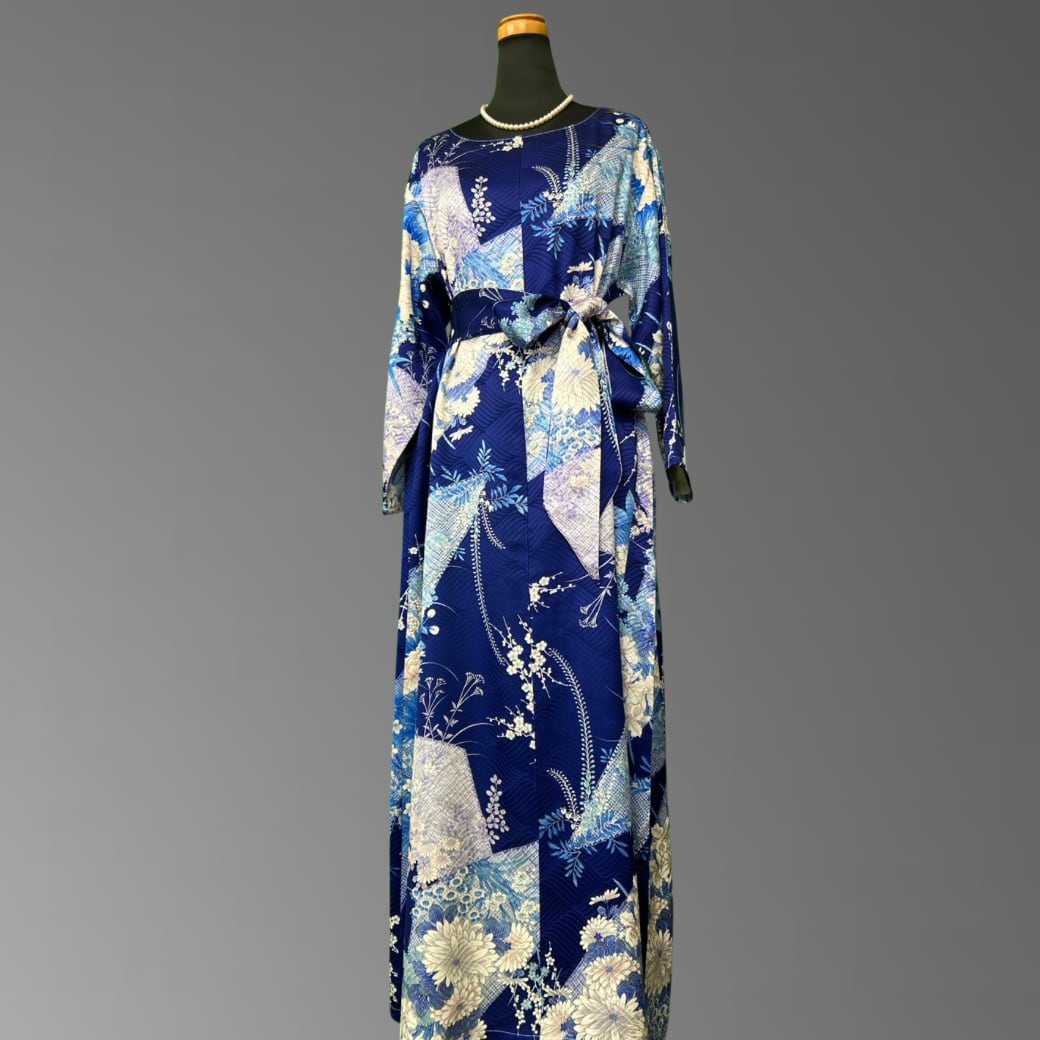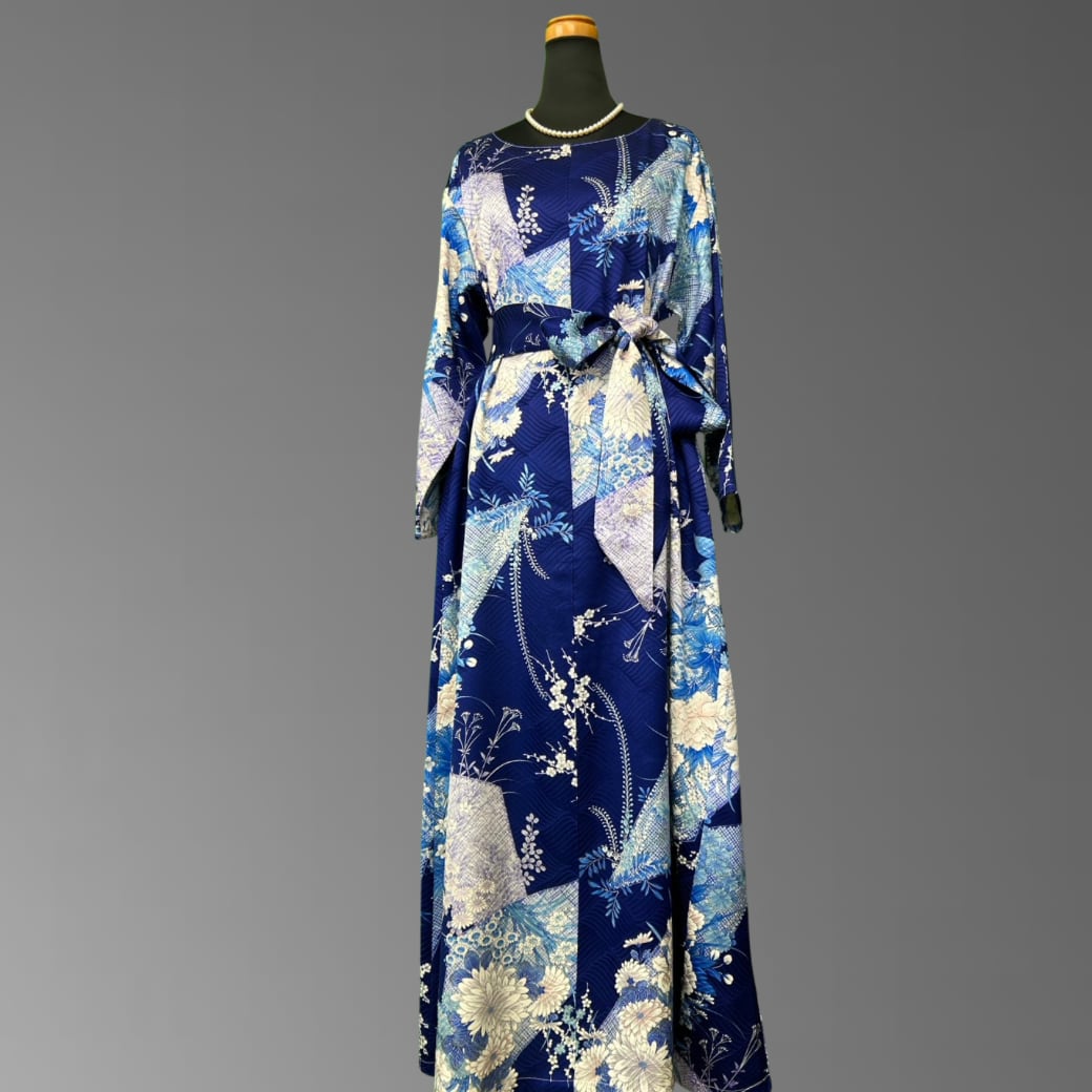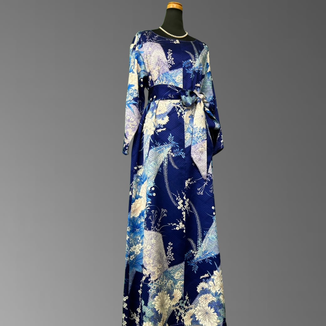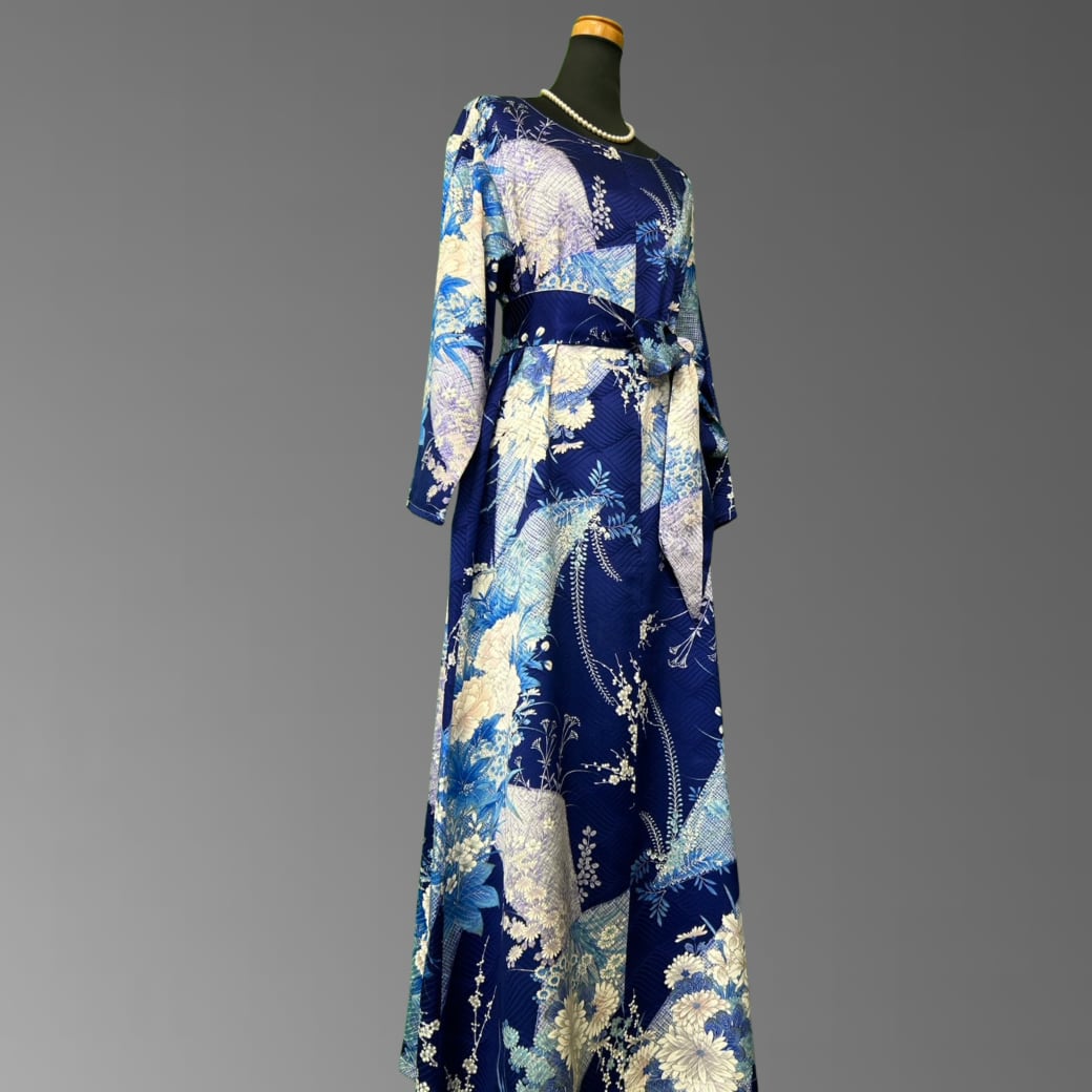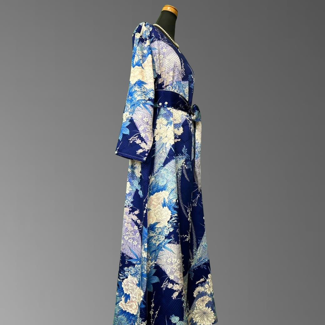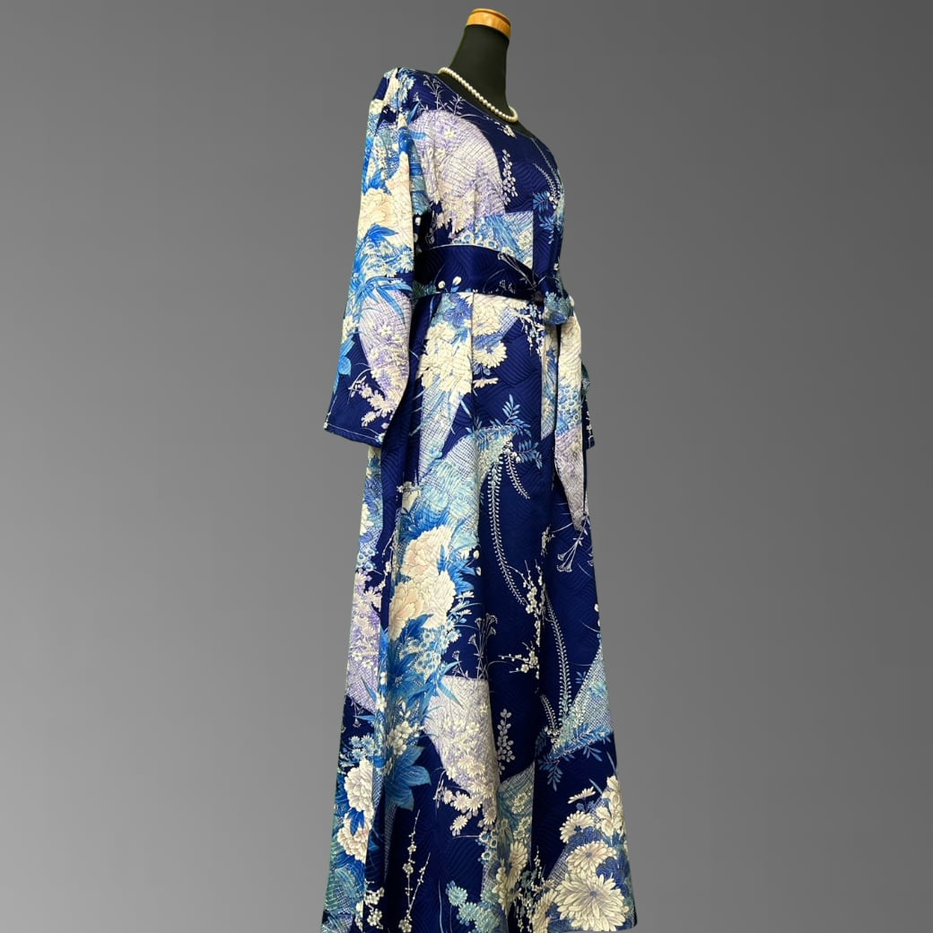 深みのある青地に、さまざまな花々が美しく咲き広がる、こちらの着物ワンピース。