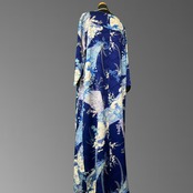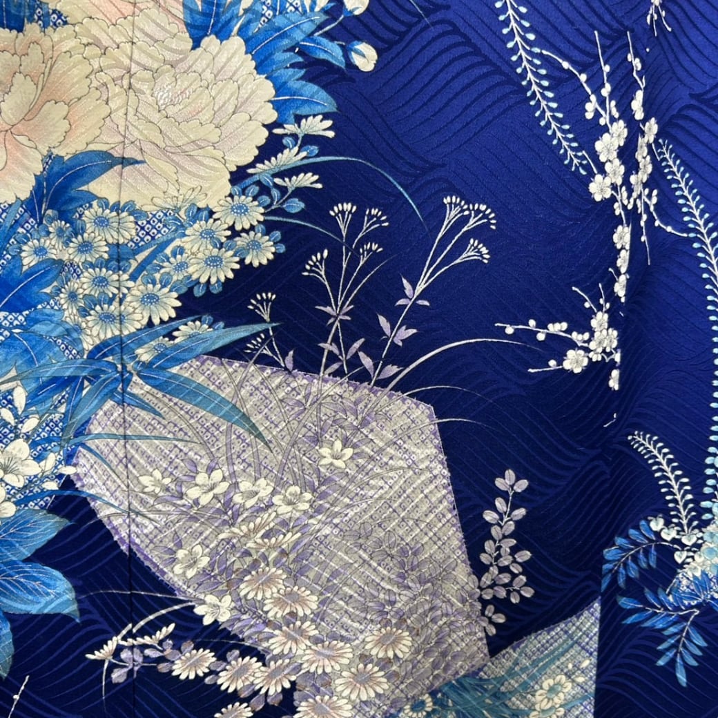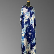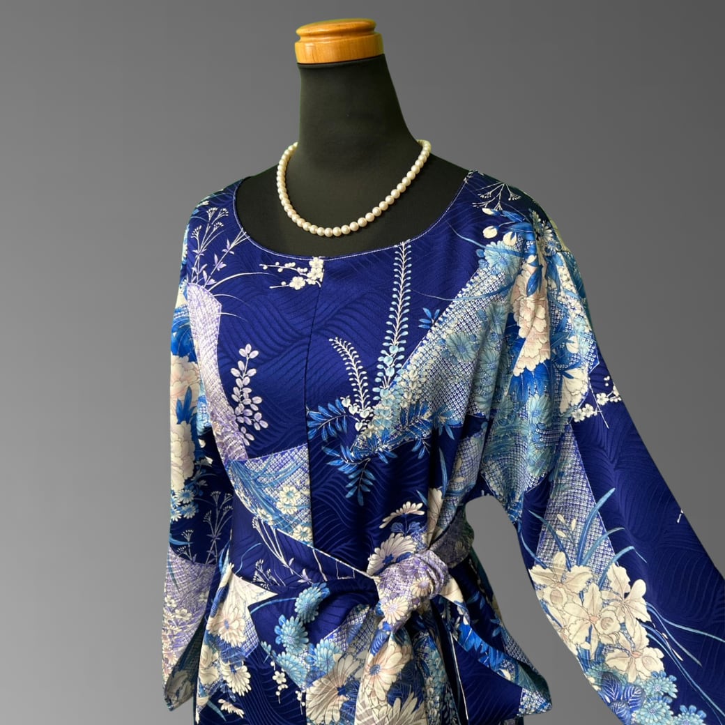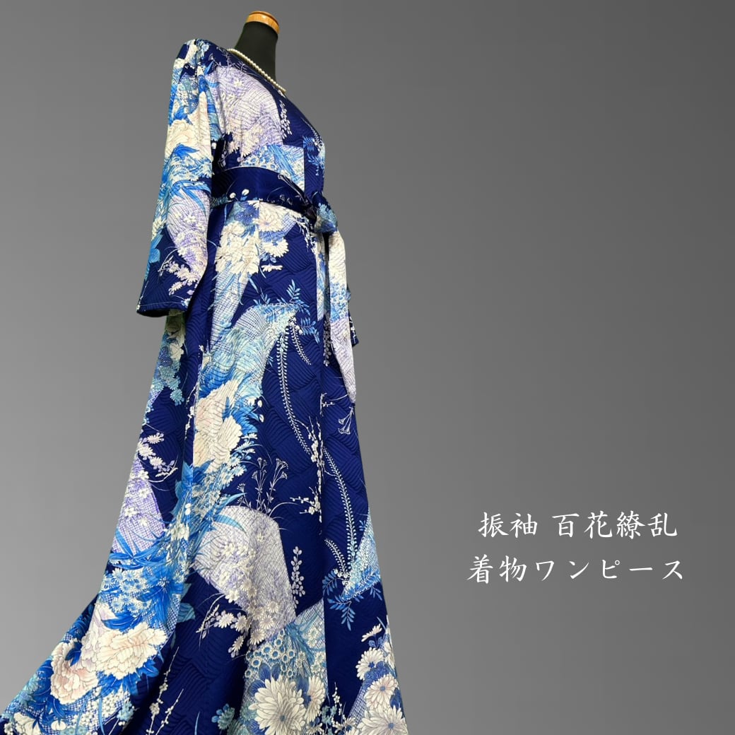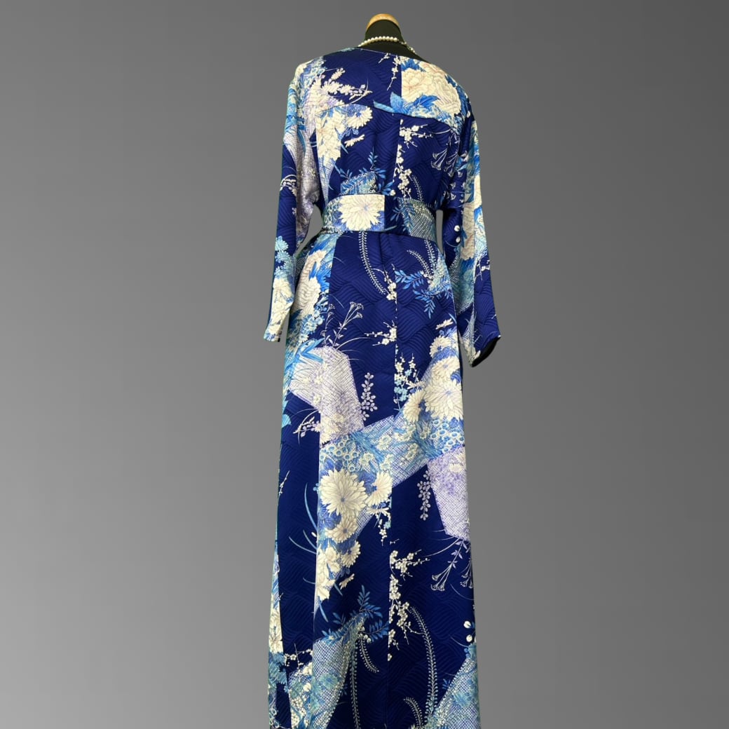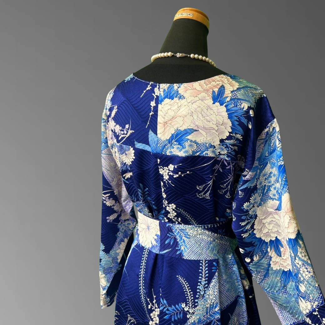 深みのある青地に、さまざまな花々が美しく咲き広がる、こちらの着物ワンピース。