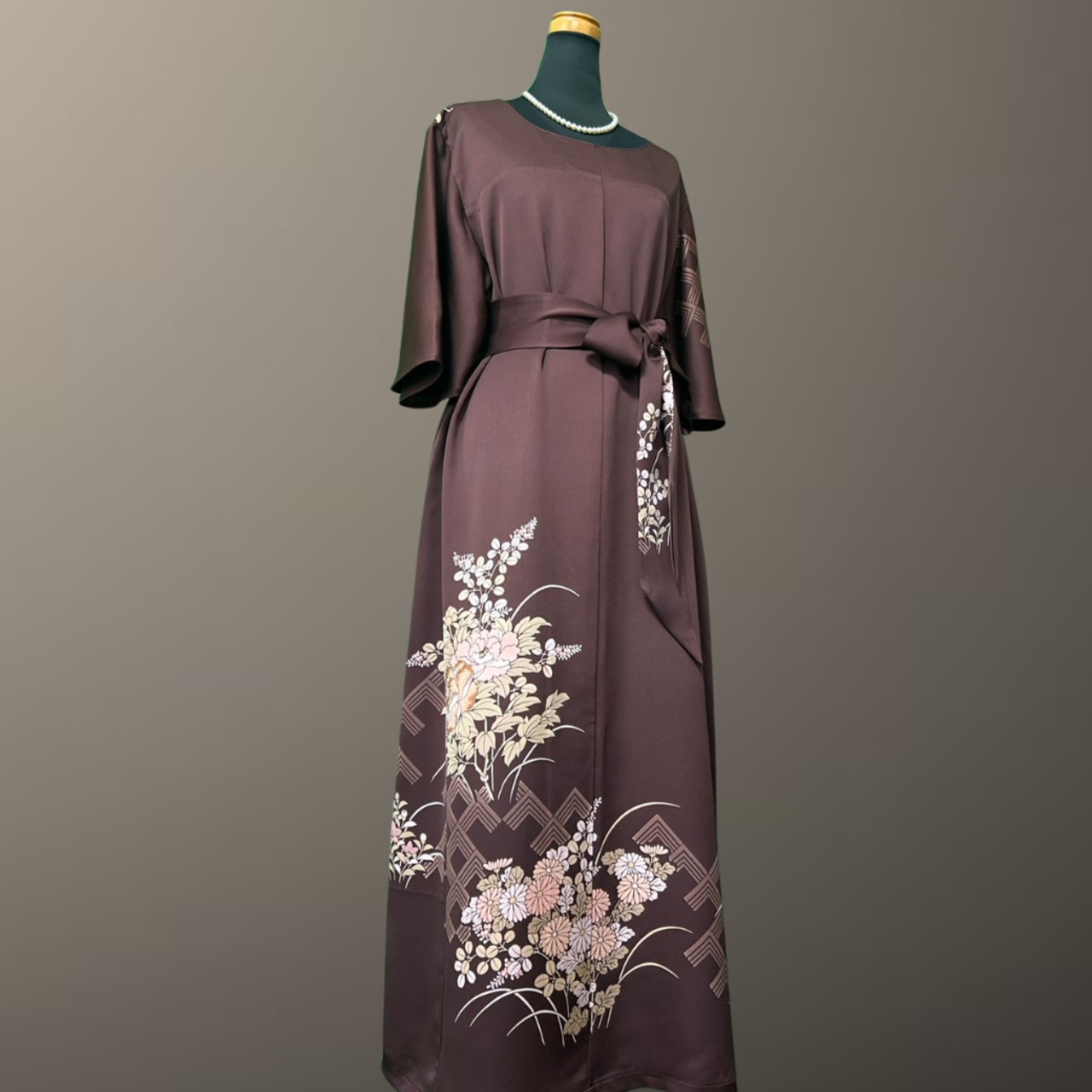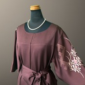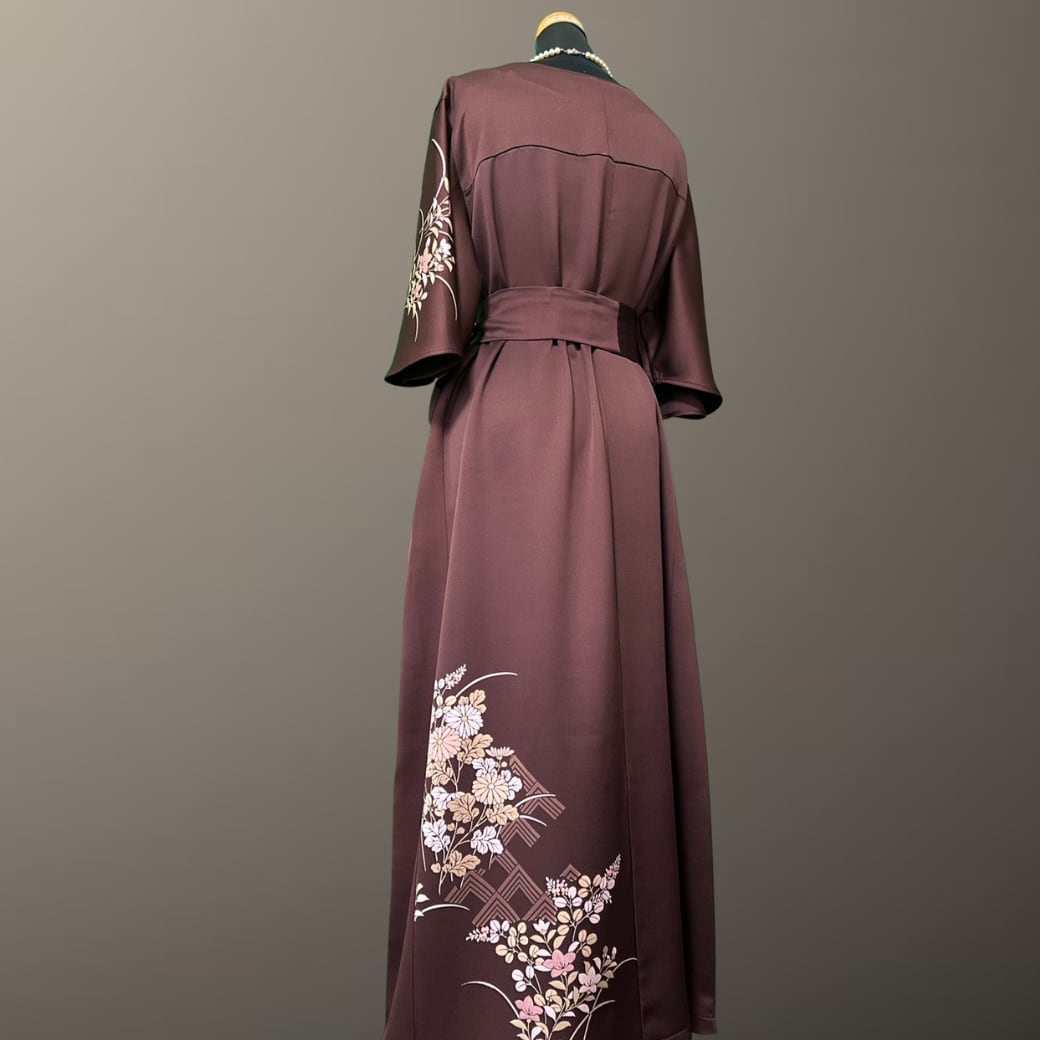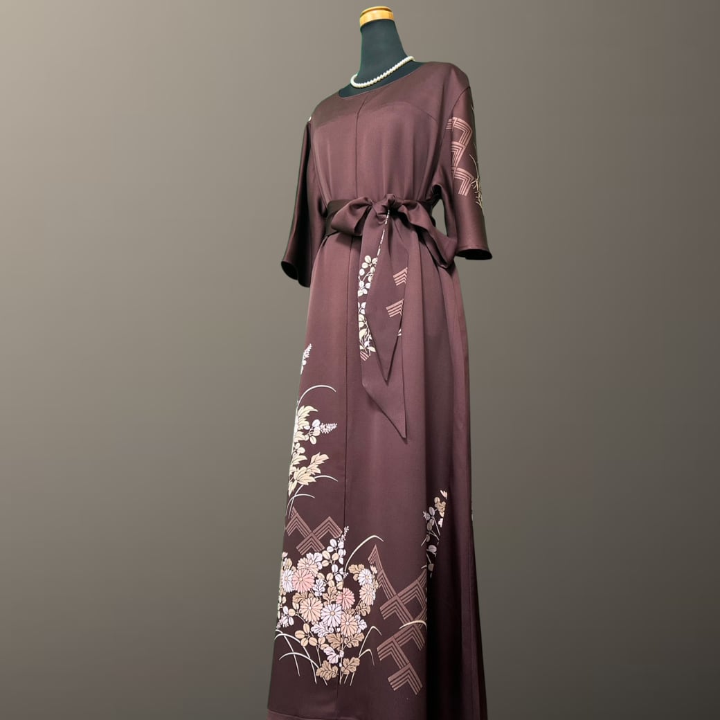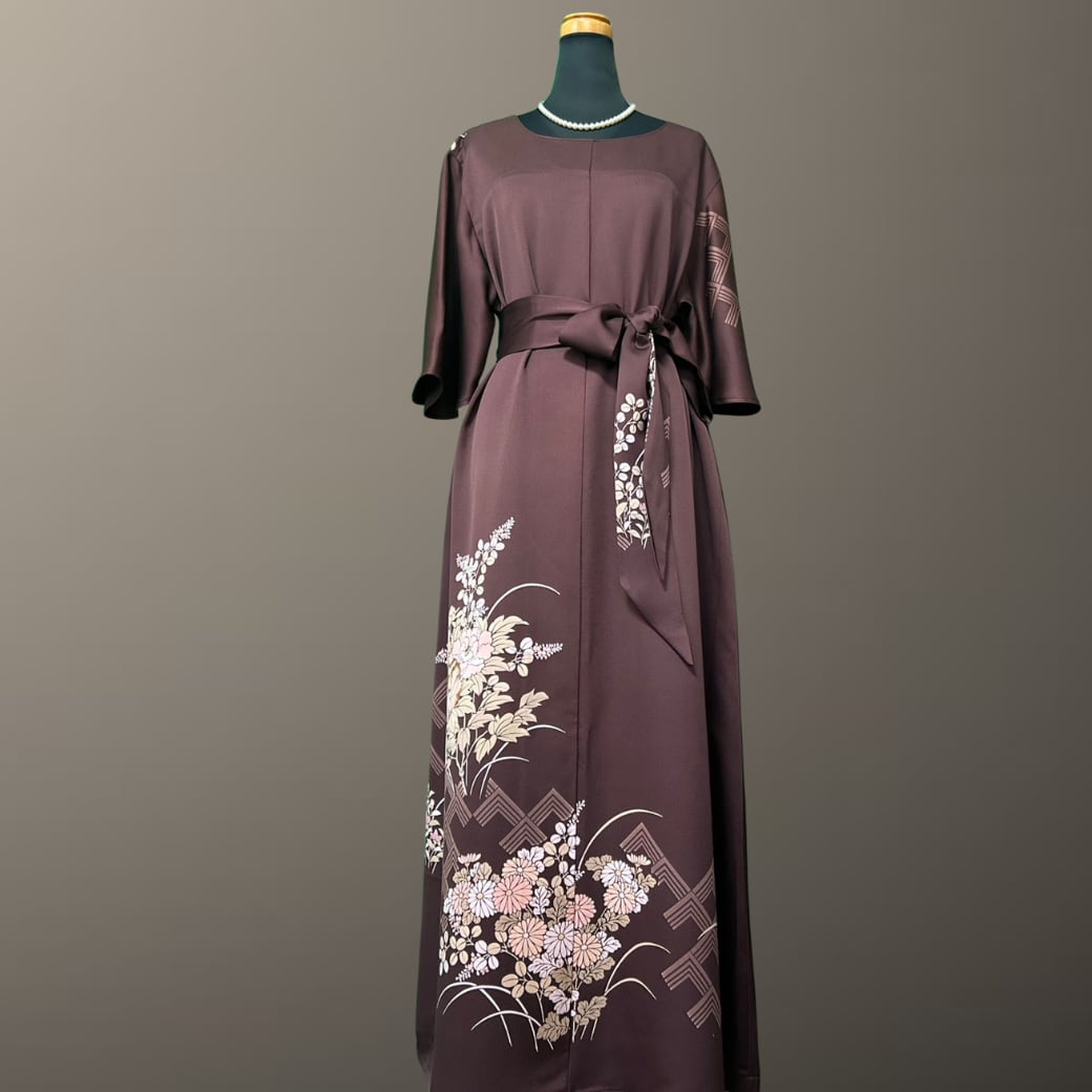 深みのある落ち着いた地色に、やわらかな花々が静かに咲き広がる、こちらの着物ワンピース。