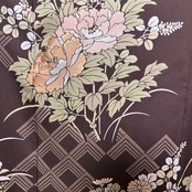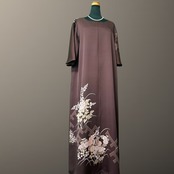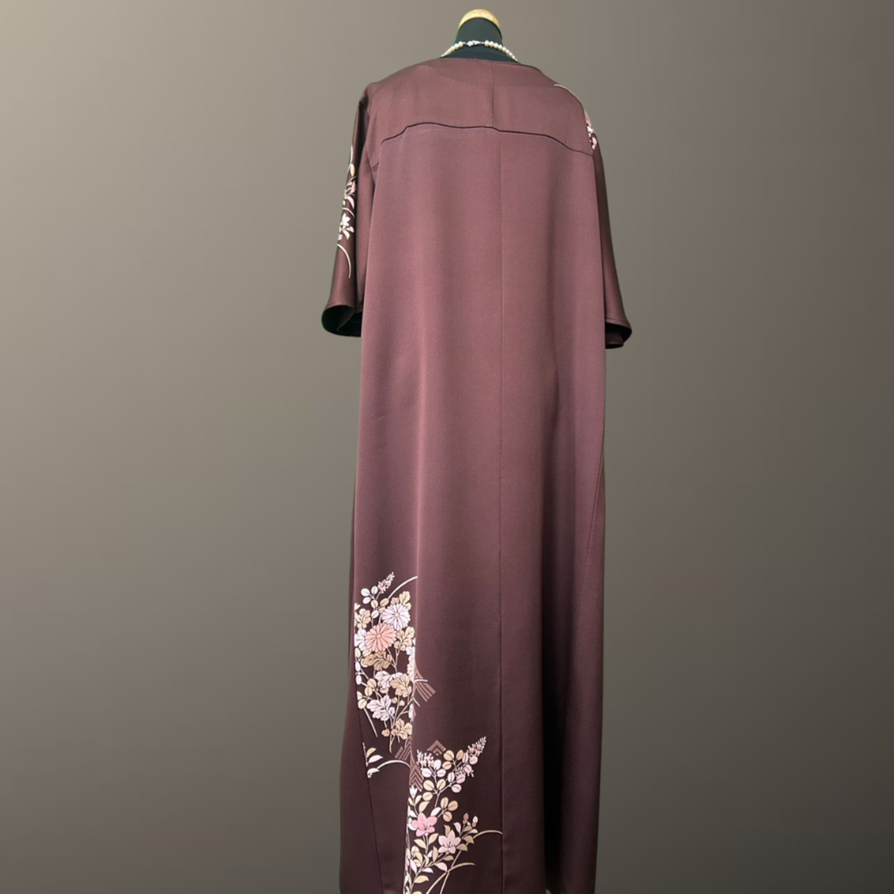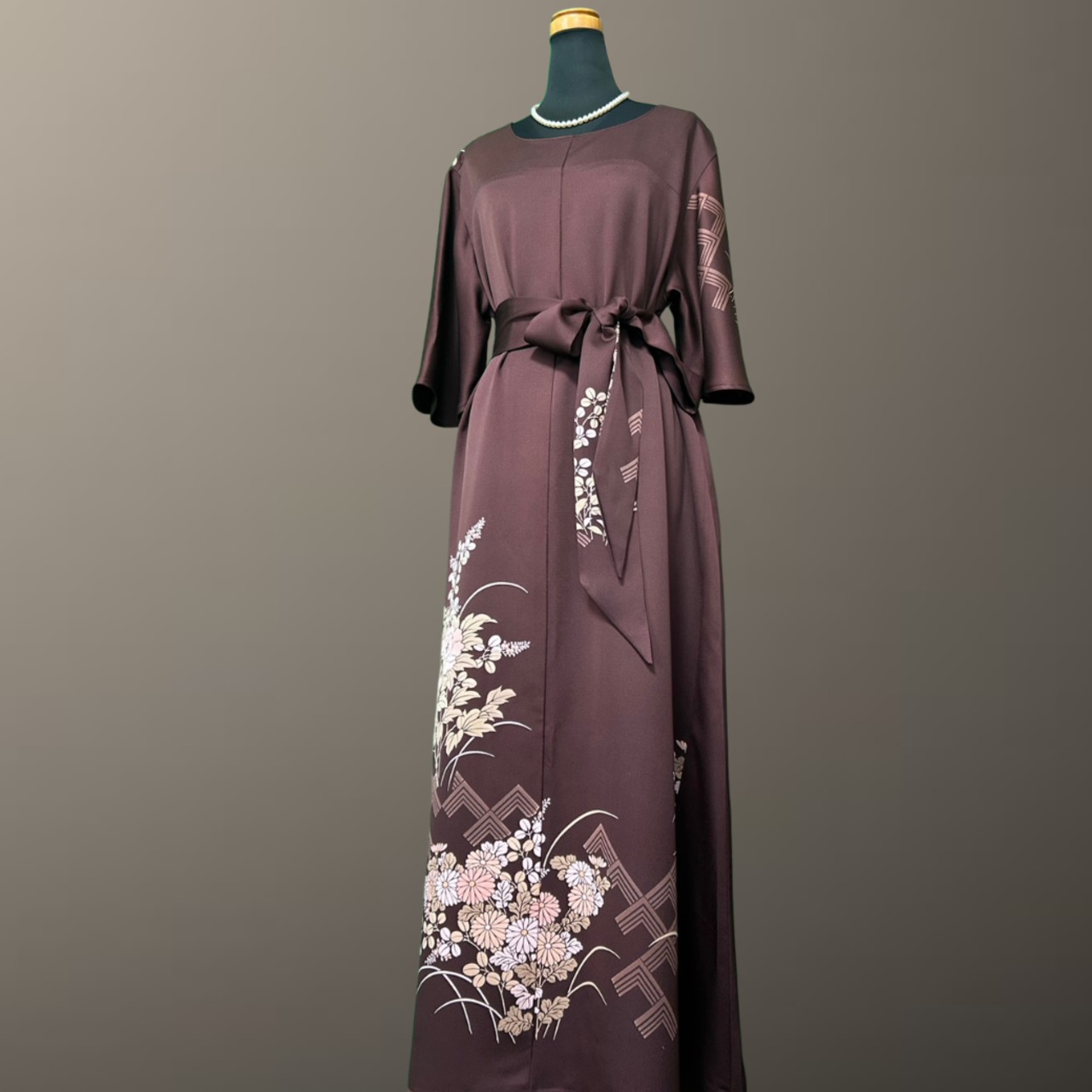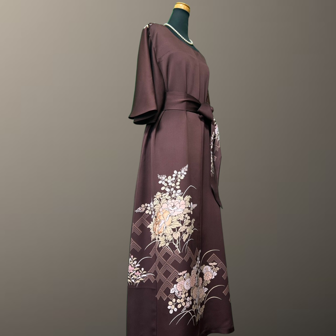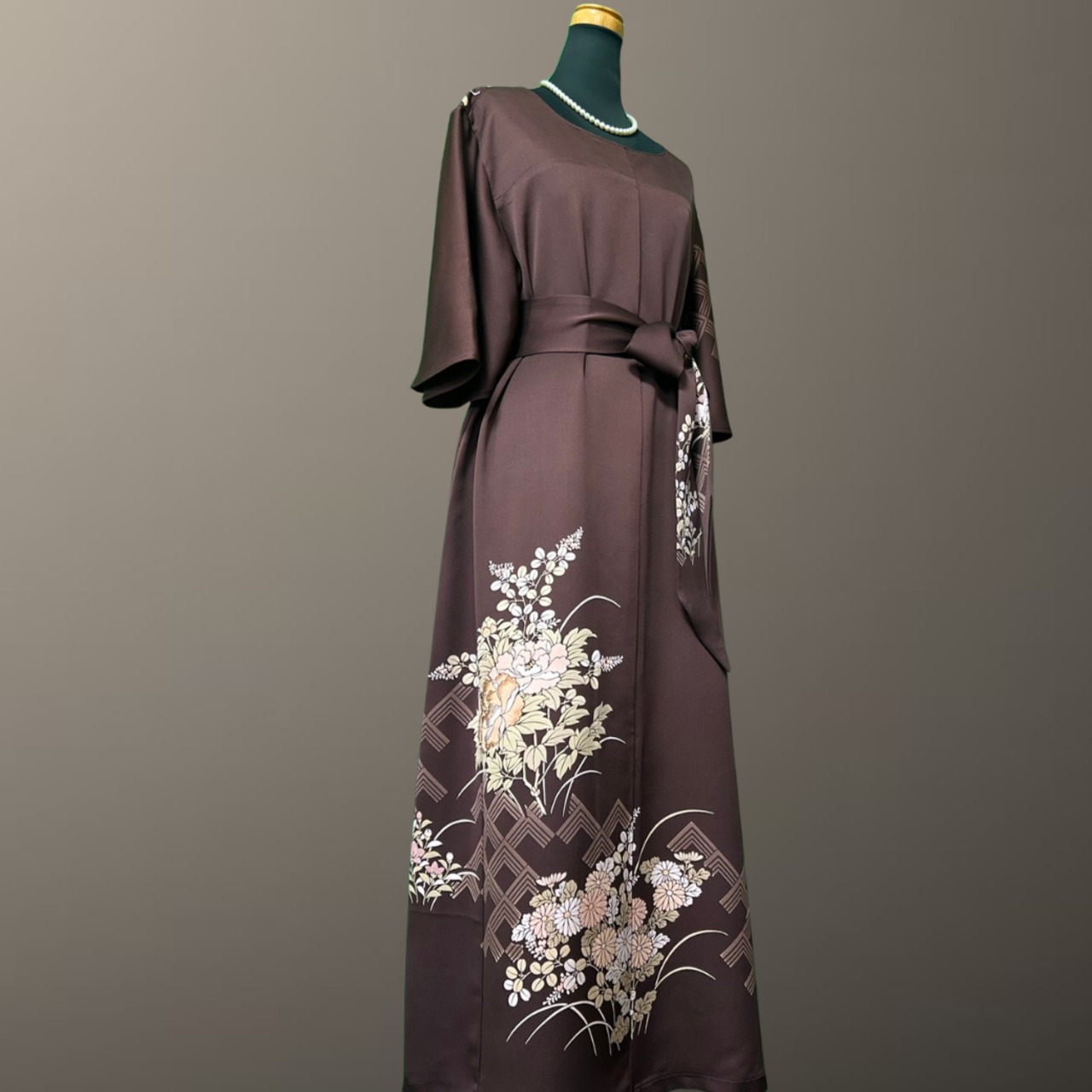 深みのある落ち着いた地色に、やわらかな花々が静かに咲き広がる、こちらの着物ワンピース。