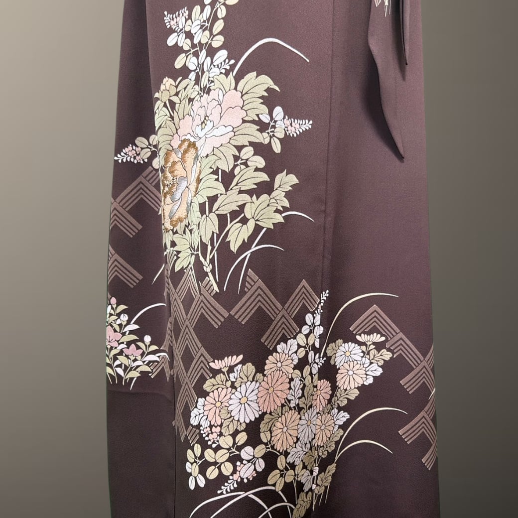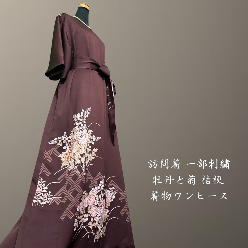 訪問着 一部刺繍 牡丹と菊 桔梗 着物ワンピース