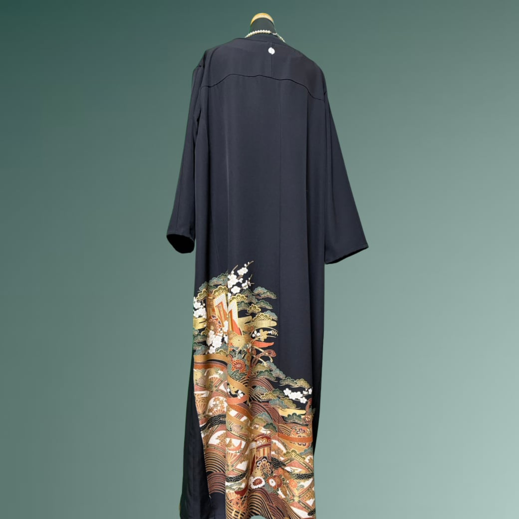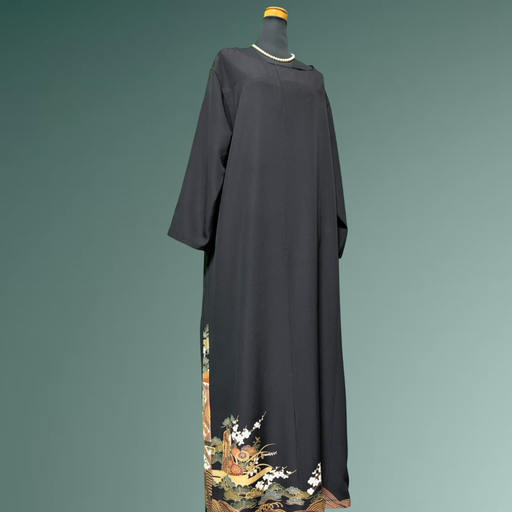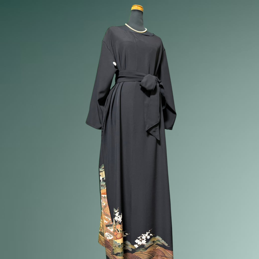 こちらの着物ワンピースは、黒留袖の格調高い佇まいに、雅な意匠が美しく描かれた一着です。
