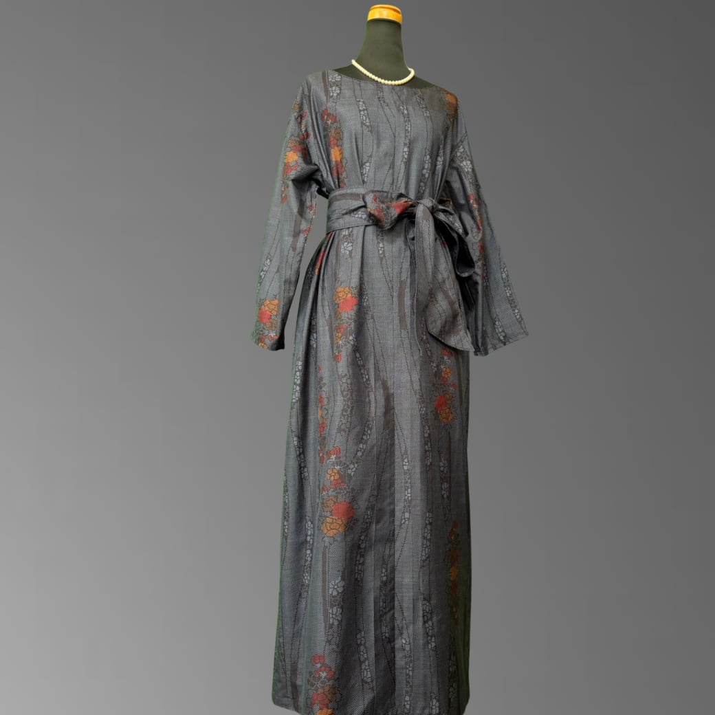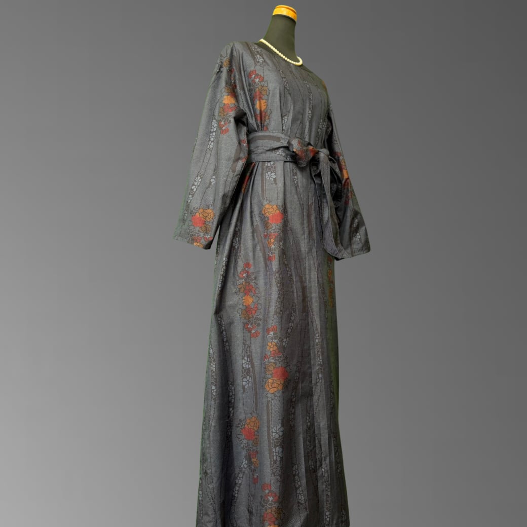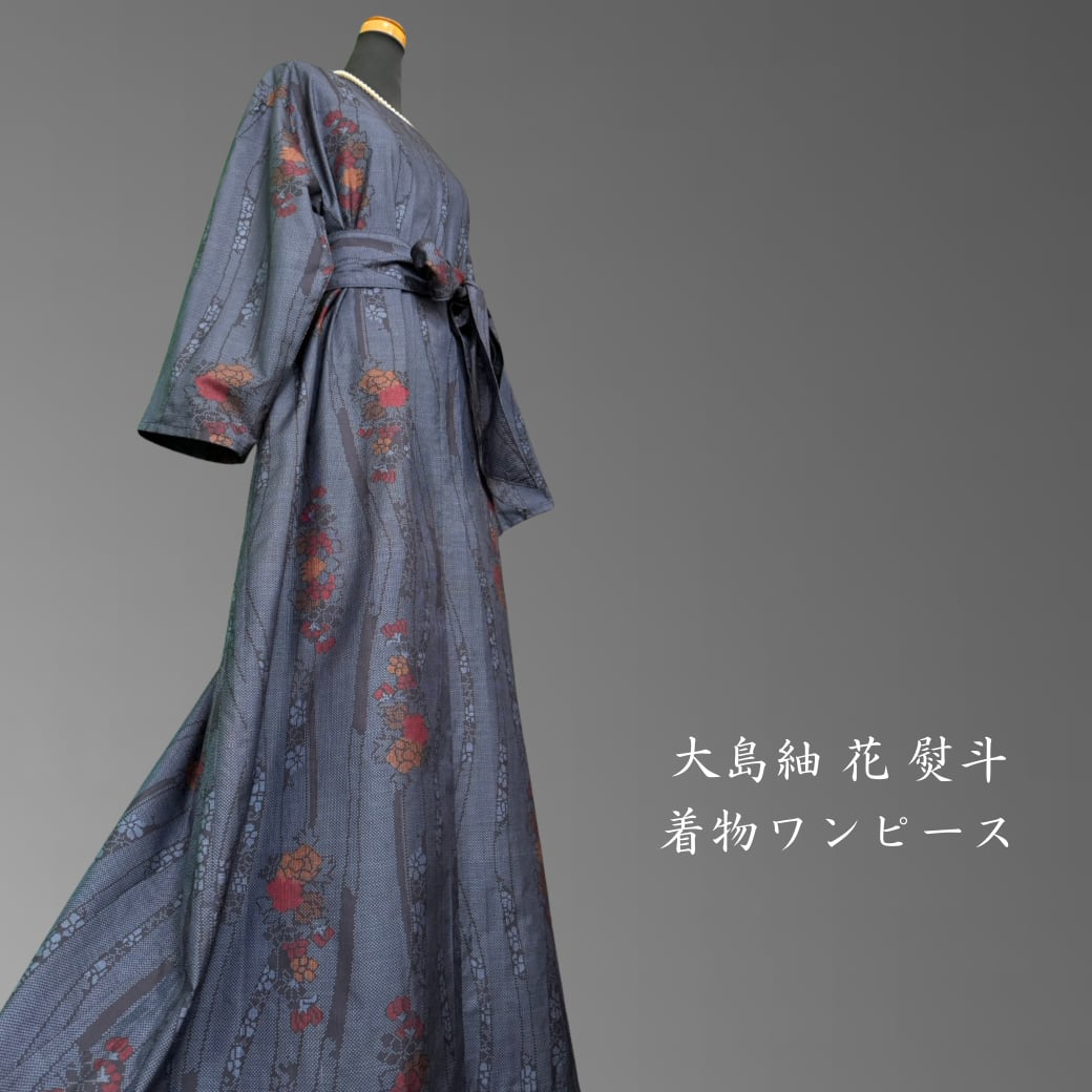 こちらの着物ワンピースは、奄美大島紬の繊細な織りに、花と熨斗をあしらった、やわらかな華やぎを纏う一着です。