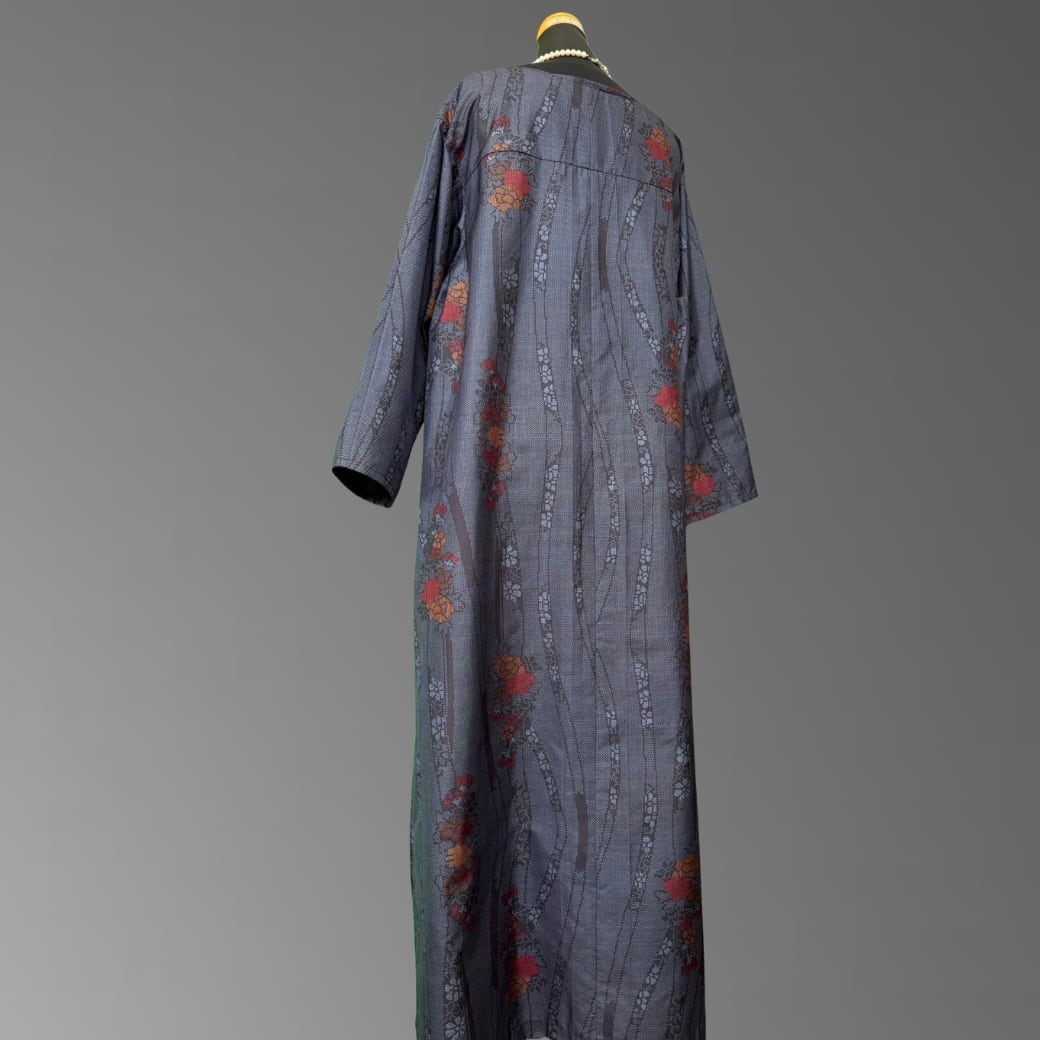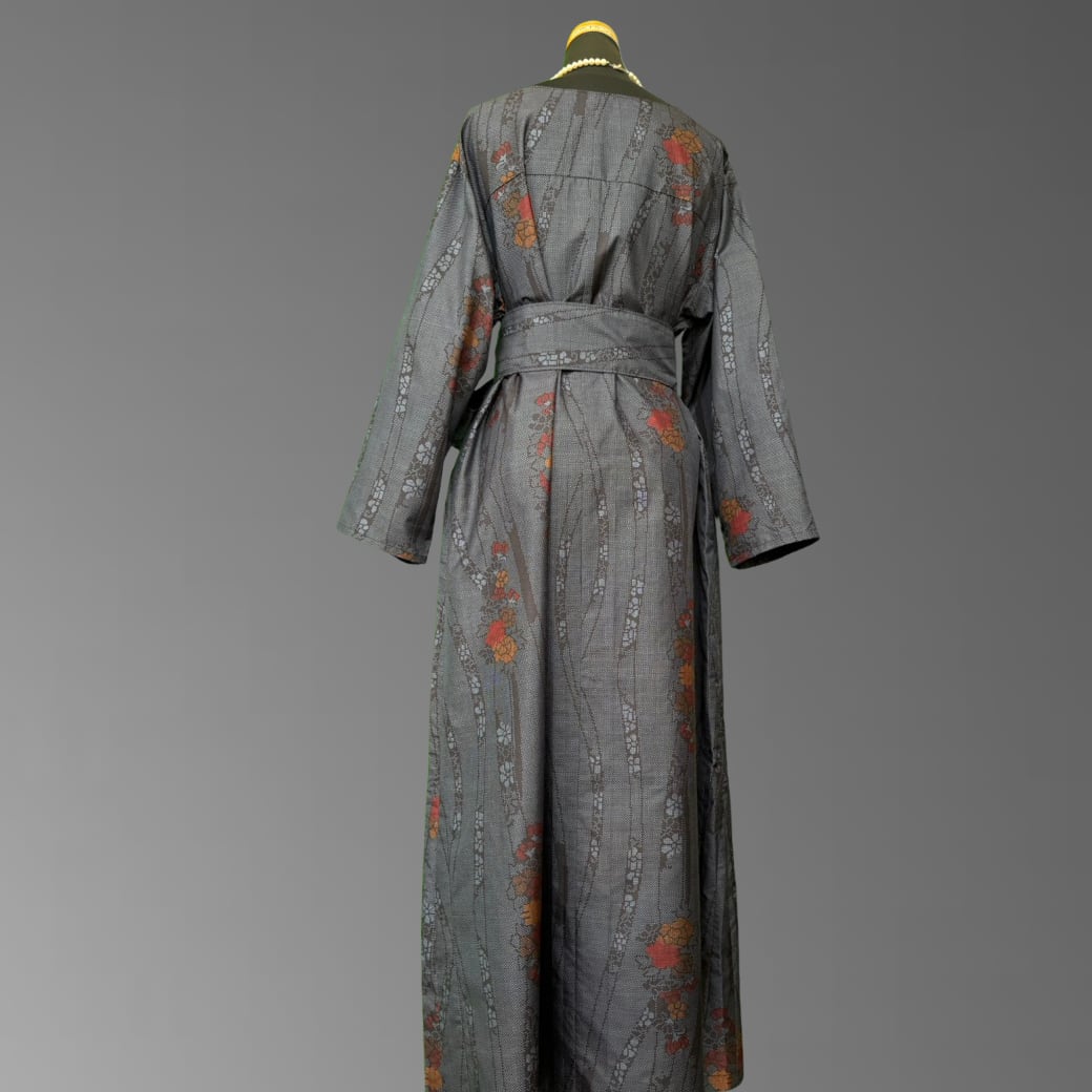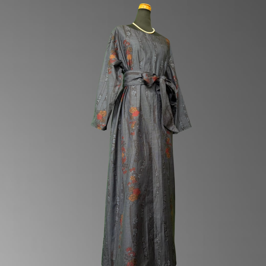 こちらの着物ワンピースは、奄美大島紬の繊細な織りに、花と熨斗をあしらった、やわらかな華やぎを纏う一着です。
