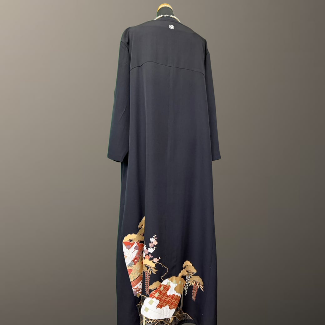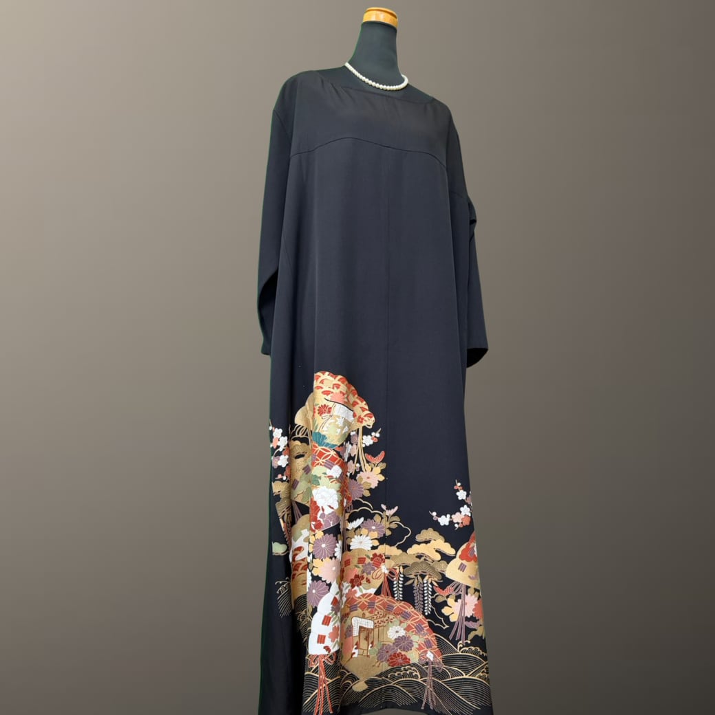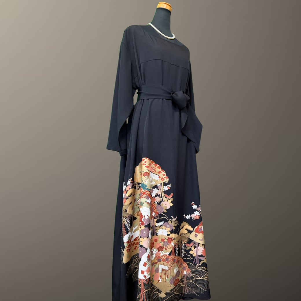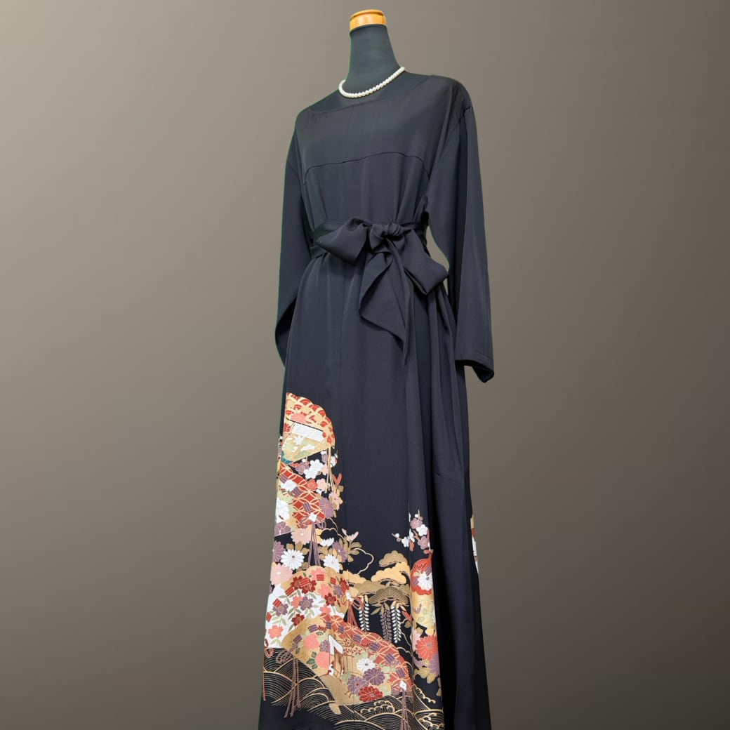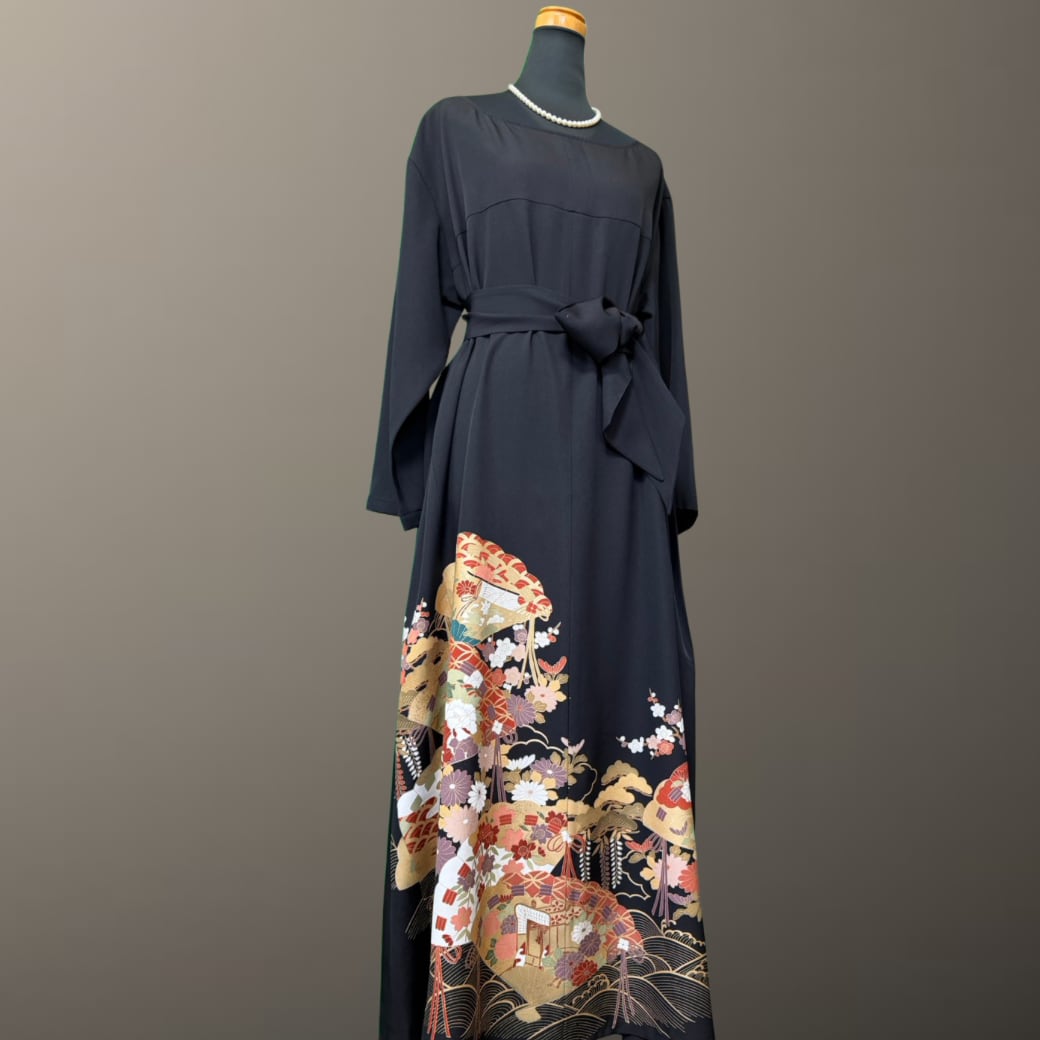 黒留袖から生まれた、波紋と檜扇の着物ワンピース。