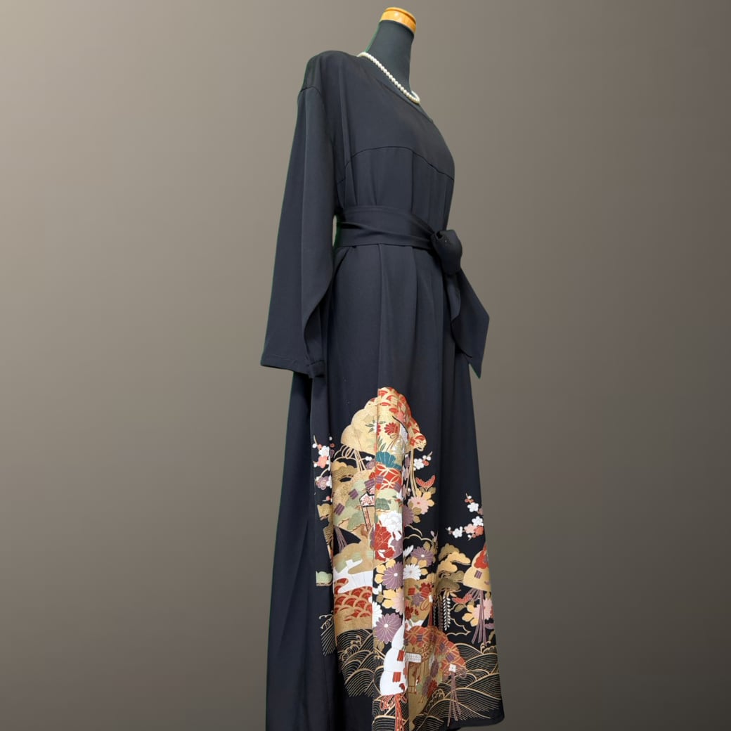 こちらの着物ワンピースは、深みのある黒地に、金彩をあしらった檜扇ややわらかに咲く花々、そして裾を彩る波紋が美しく重なる、格調高い一着です。落ち着いた佇まいのなかに、雅やかな華やぎが宿り、黒留袖ならではの品格を感じさせます。