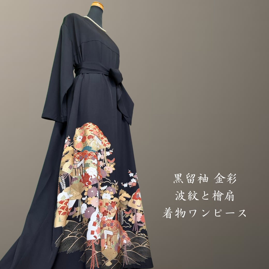 黒留袖 金彩 波紋と檜扇 着物ワンピース