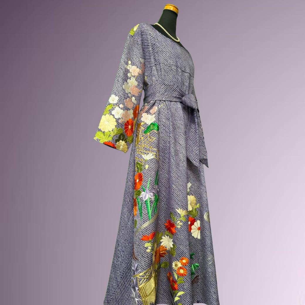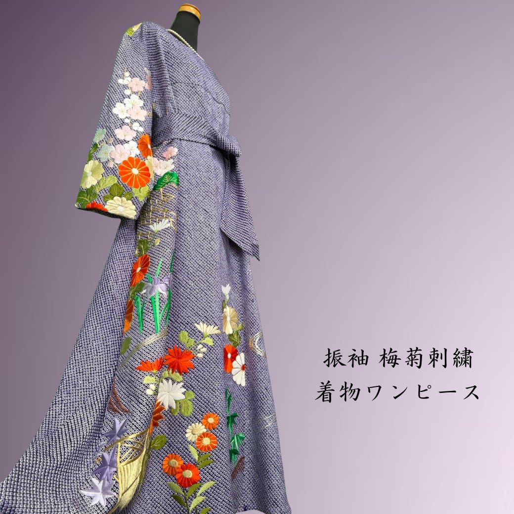 振袖から生まれた、梅と菊の刺繍が華やかに映える着物ワンピース。