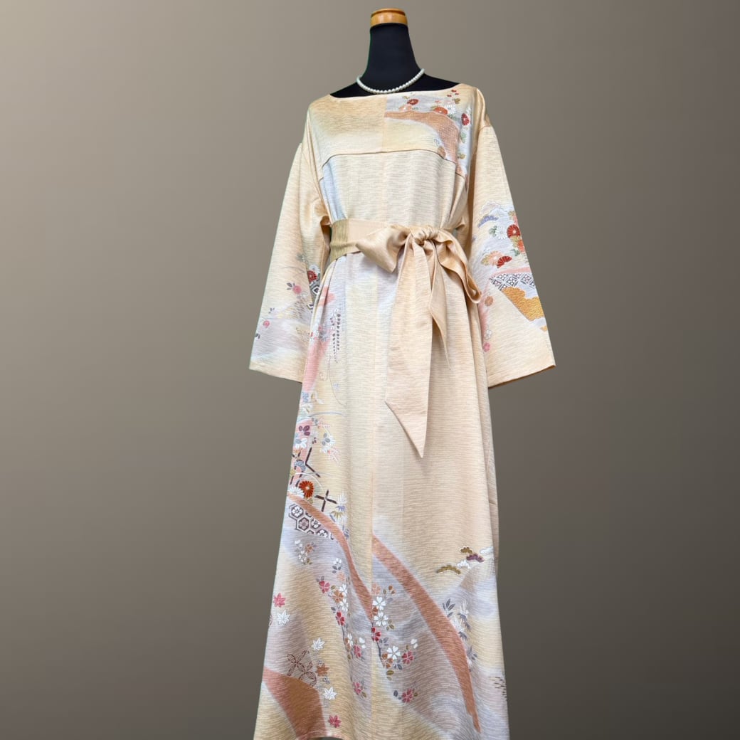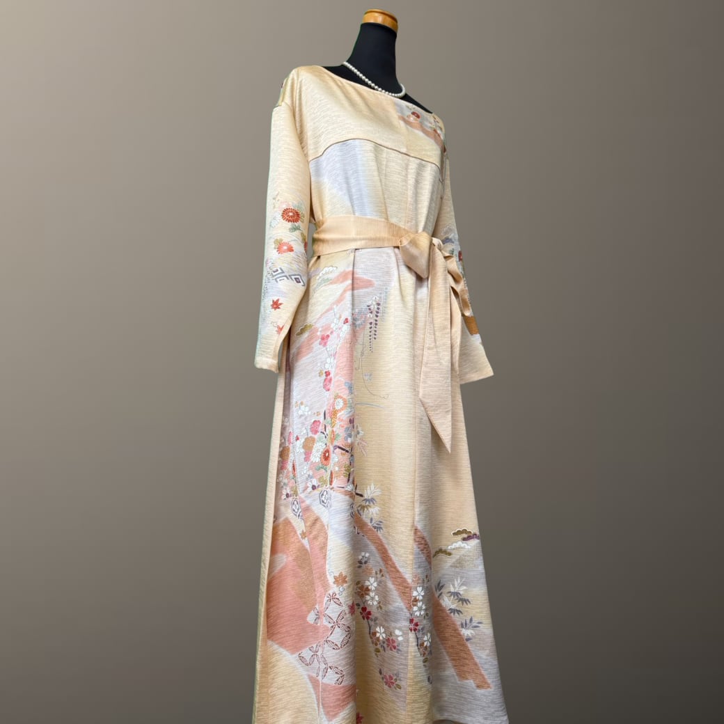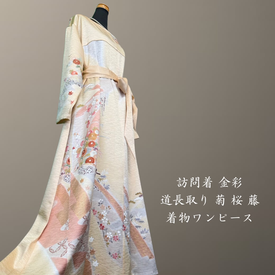訪問着から生まれた、金彩と道長取り、菊、桜、藤がやさしく映える着物ワンピース。