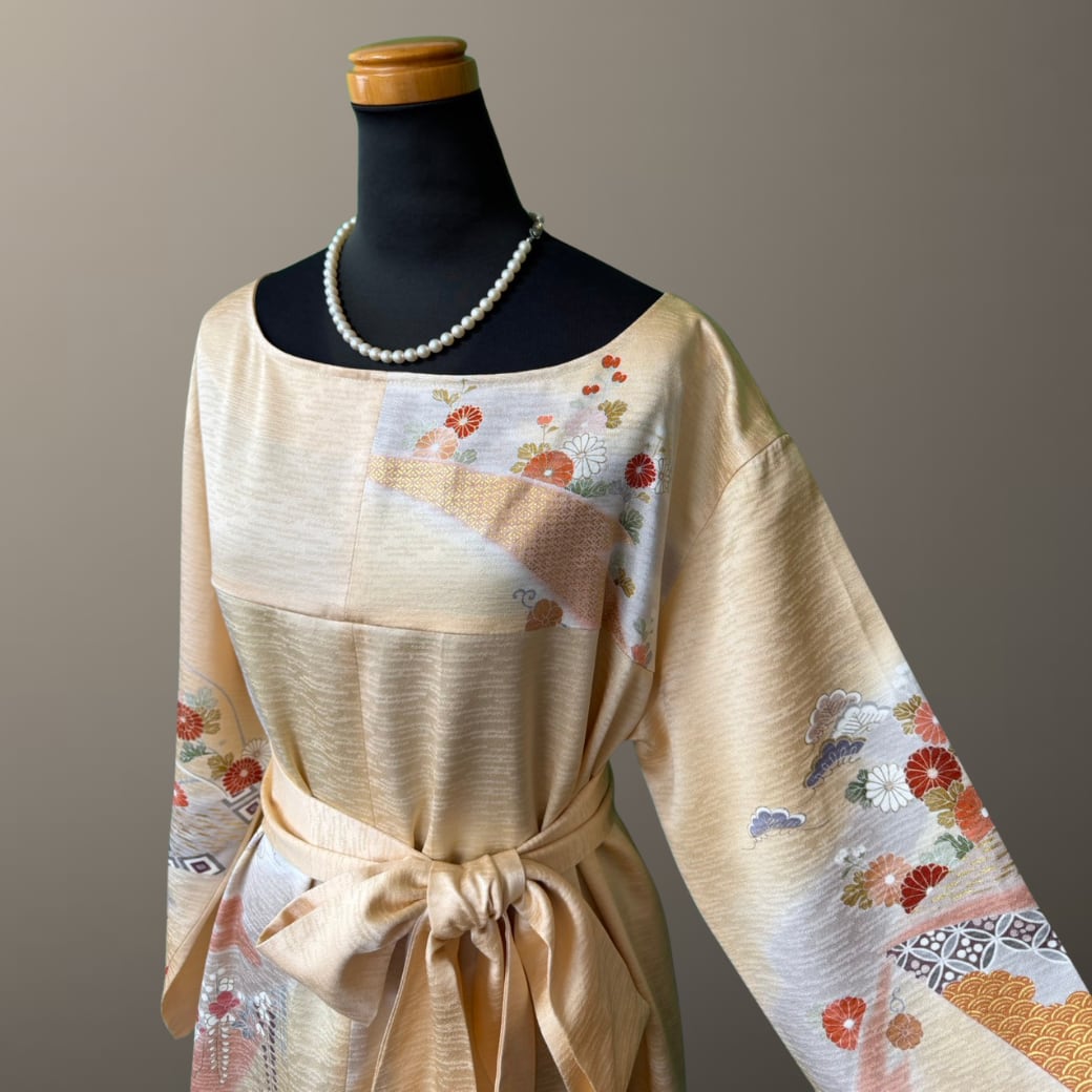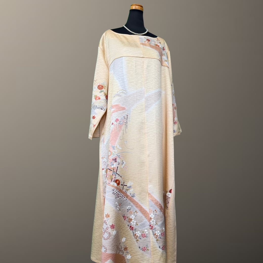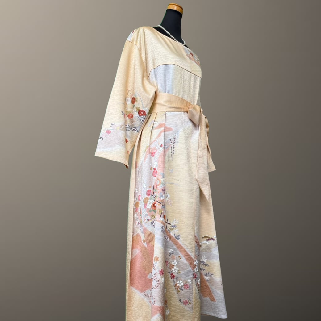 訪問着から生まれた、金彩と道長取り、菊、桜、藤がやさしく映える着物ワンピース。