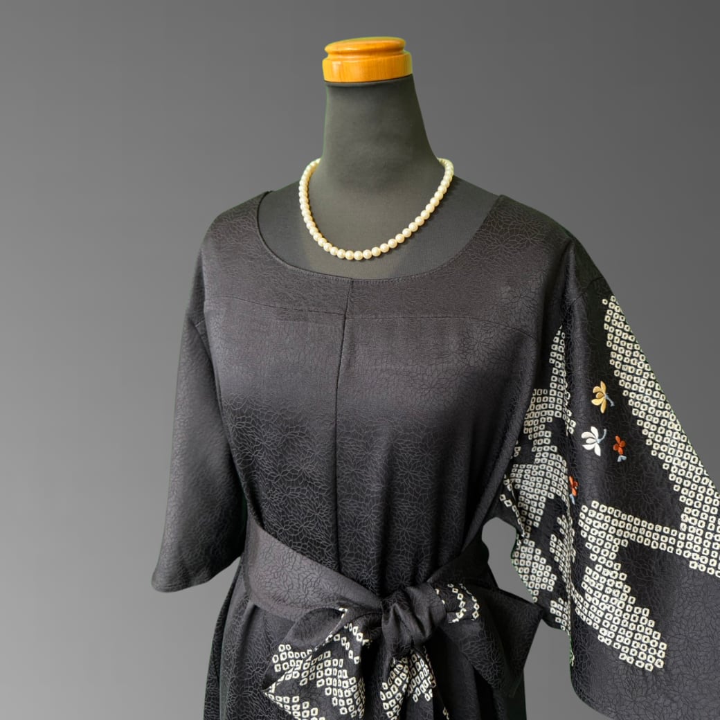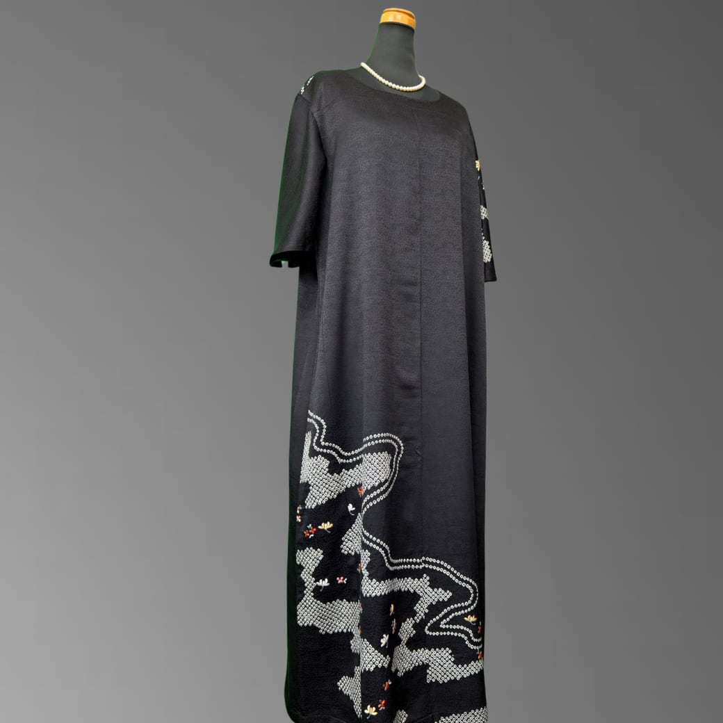 こちらの着物ワンピースは、深みのある黒地に、やわらかく流れる流水紋と、可憐な小花の刺繍が映える一着です。