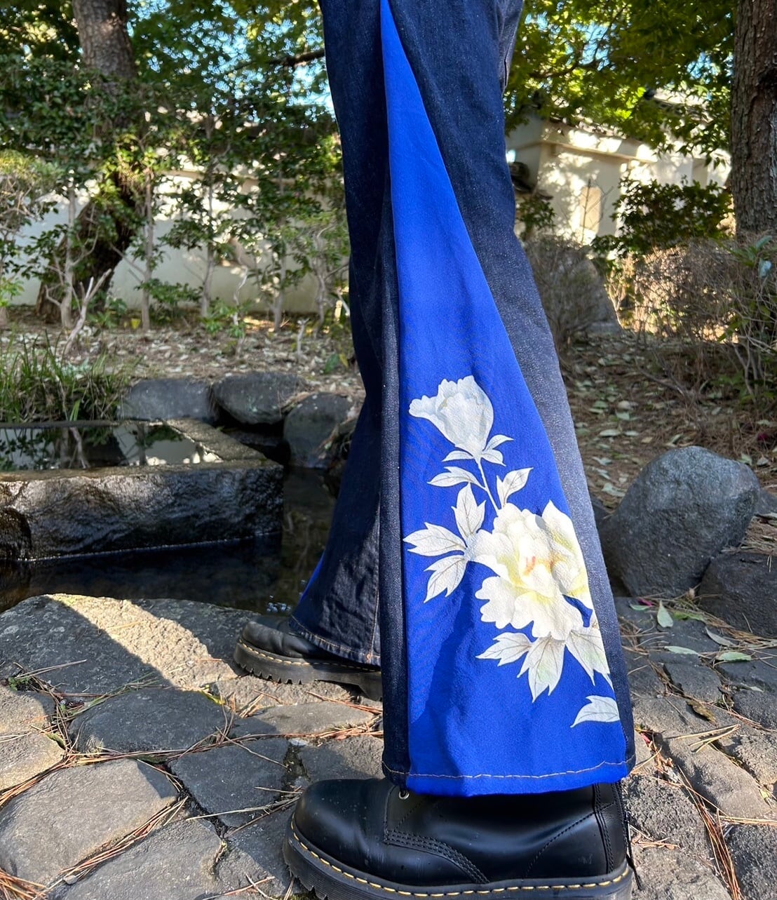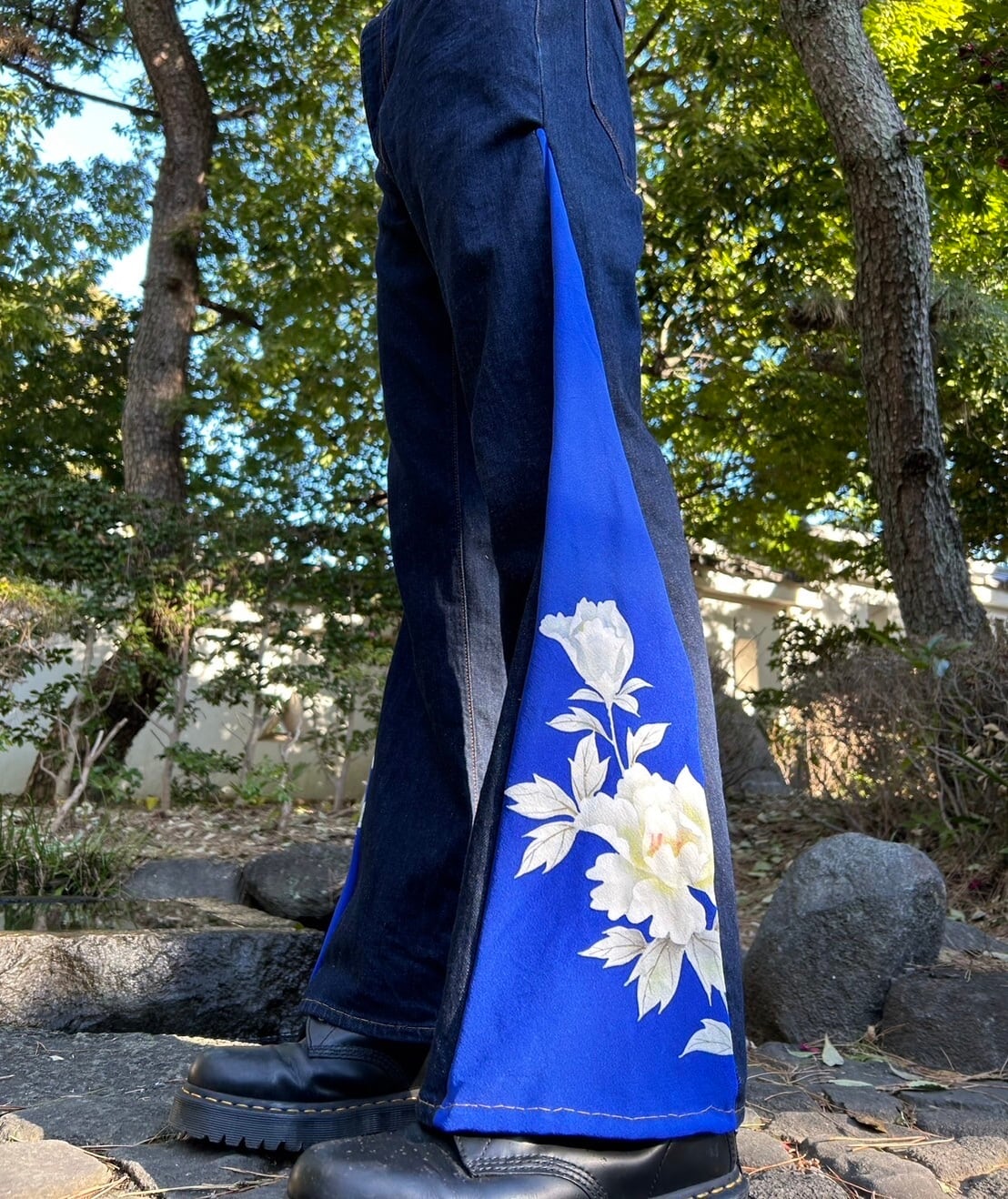 こちらの着物の柄は、立てば芍薬、座れば牡丹、歩く姿はユリの花というように、デザインもシルエットも美しさにこだわったデニムです。