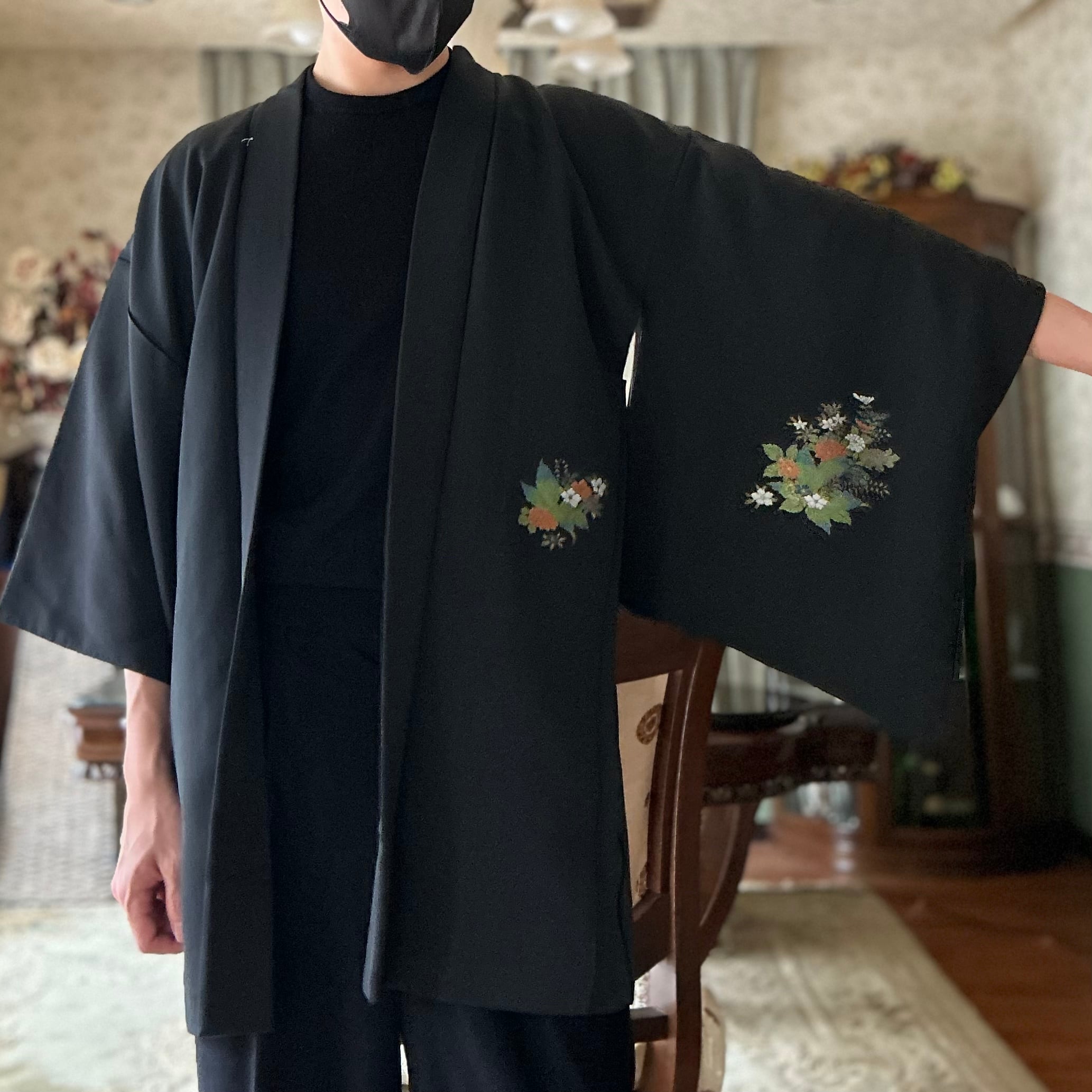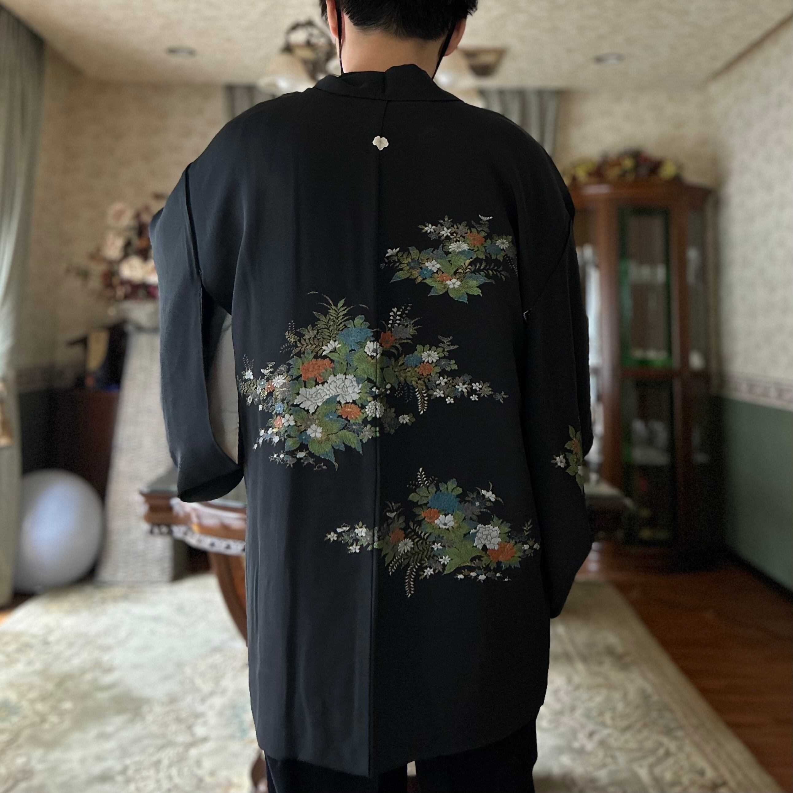 この牡丹と藤柄の羽織は、日本の伝統的な牡丹と藤の柄をモチーフにしたエレガントなデザインが特徴です。牡丹と藤の優雅な柄が、上品で華やかな印象を与えます。
